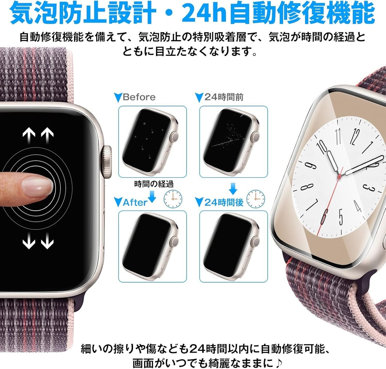 装着感はゼロ・99.9%高透過率:まるでつけていないような99.9%高透過率を実現し、Apple Watch本来の美しさをそのままに!高い透明感でApple Watch画面の精細さを保ちます。アップルウォッチ本体との一体感も溢れています。