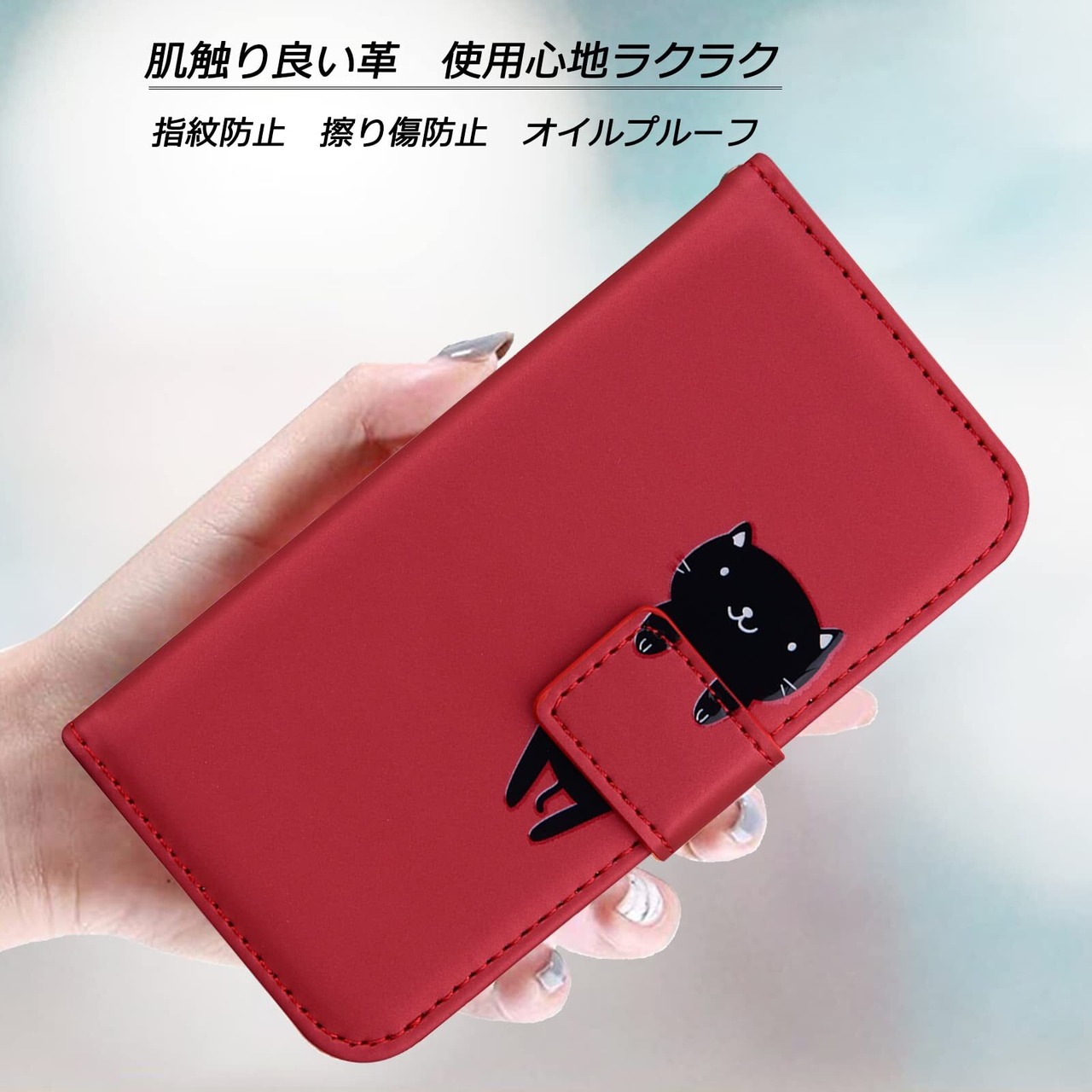 ❹【スマイル猫ちゃんのデザインと上質な素材】型押しの可愛い猫のモチーフと上品なレザーの組み合わせるケースであり、高級感ある色合いでちょっぴり大人なスマホケース。裏側ケースはソフトのtpuで仕上げられて、着脱も便利です。