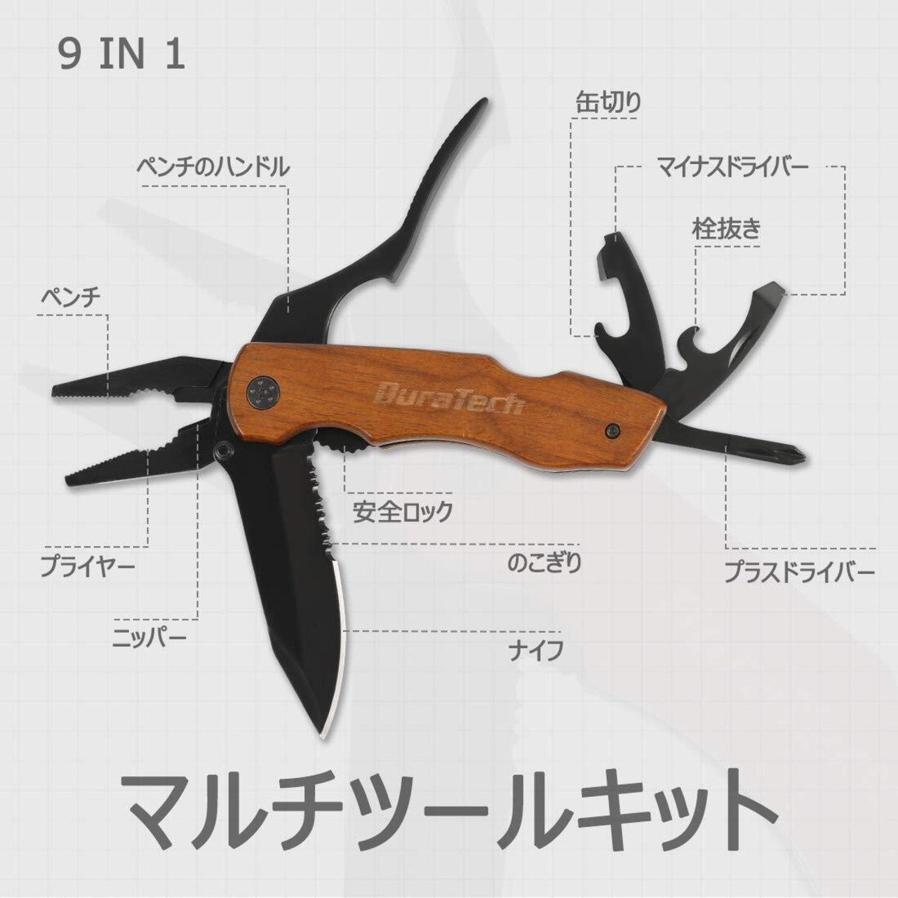 【9-in-1マルチツール】万能マルチツールはプラスドライバー、マイナスドライバー、栓抜き、缶切り、のこぎり、ナイフ、ペンチ、プライヤーやニッパーとしての主体が実用性抜群です。一つで9つの機能を搭載しており、多目的に大活躍になります。このマルチツールは工具にもサバイバルツールにもなるし、1本で色々な使い方ができます。