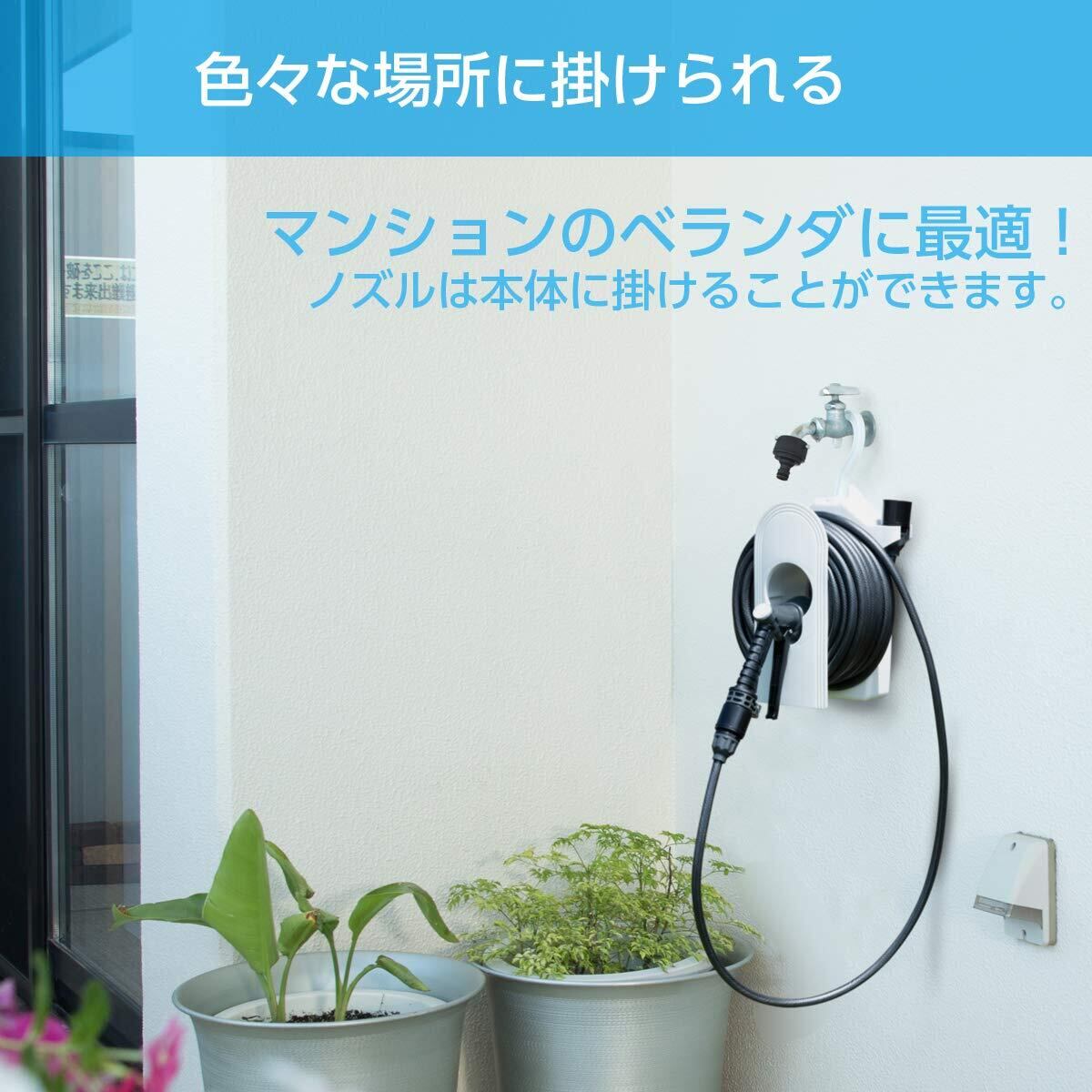 狭い場所での散水や、ベランダでの水やりに便利なハンガータイプのコンパクトリールです。 散水ノズルの水形は7種類です。 横水栓、万能ホーム水栓、自在水栓(蛇口外径14mm~18mm)の 蛇口には付属の蛇口ニップルでそのまま取り付け可能です。