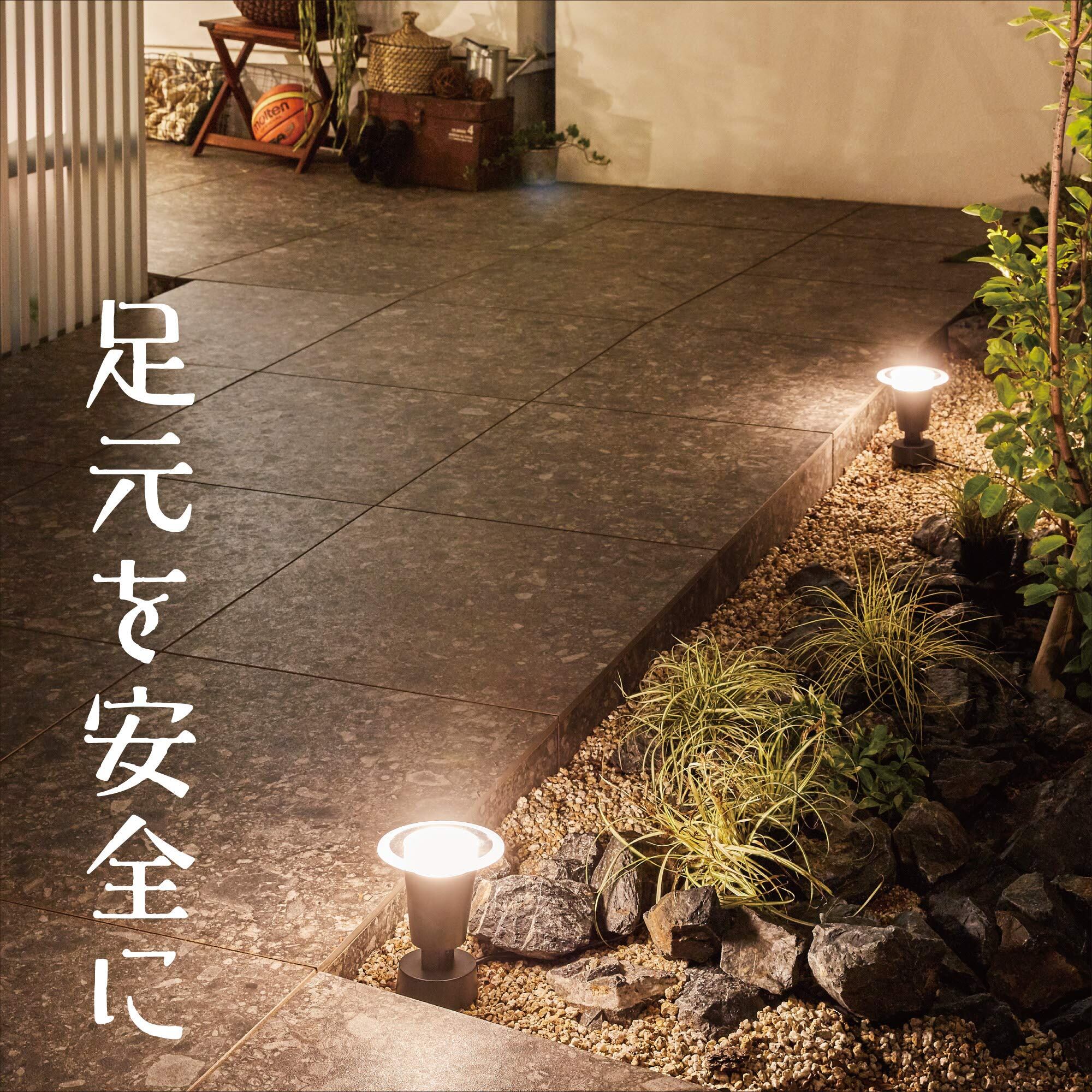 【庭のプロが 演出に使う光量】市販のソーラーライトなどでは実現できない明るさ。明暗が美しく、住まいの印象をガラリと変えることができます。それぞれのライトは用途に合わせて、エクステリアのプロが使う明るさを採用しています。