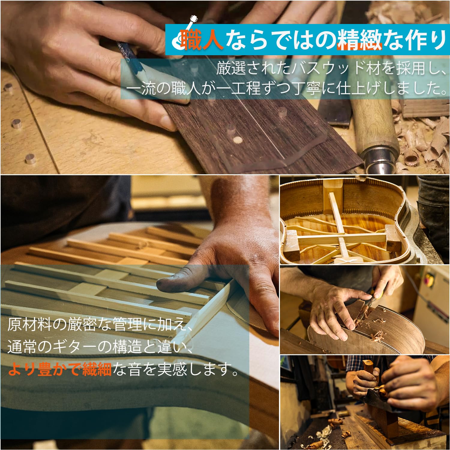 【厳選した木材・高品質な工芸】明るい音色と幅広い音域を確保するため、アコースティックギターは厳選されたバスウッド材を採用し、一流の職人が一工程ずつ丁寧な仕上げにより、上質な手触りと素晴らしい演奏体験をお届けします。また、ギターの表面は滑らかに加工されており、お手入れも簡単です。そのため、長期間使用してもアコースティック・ギターはエレガントな外観を保ちます。