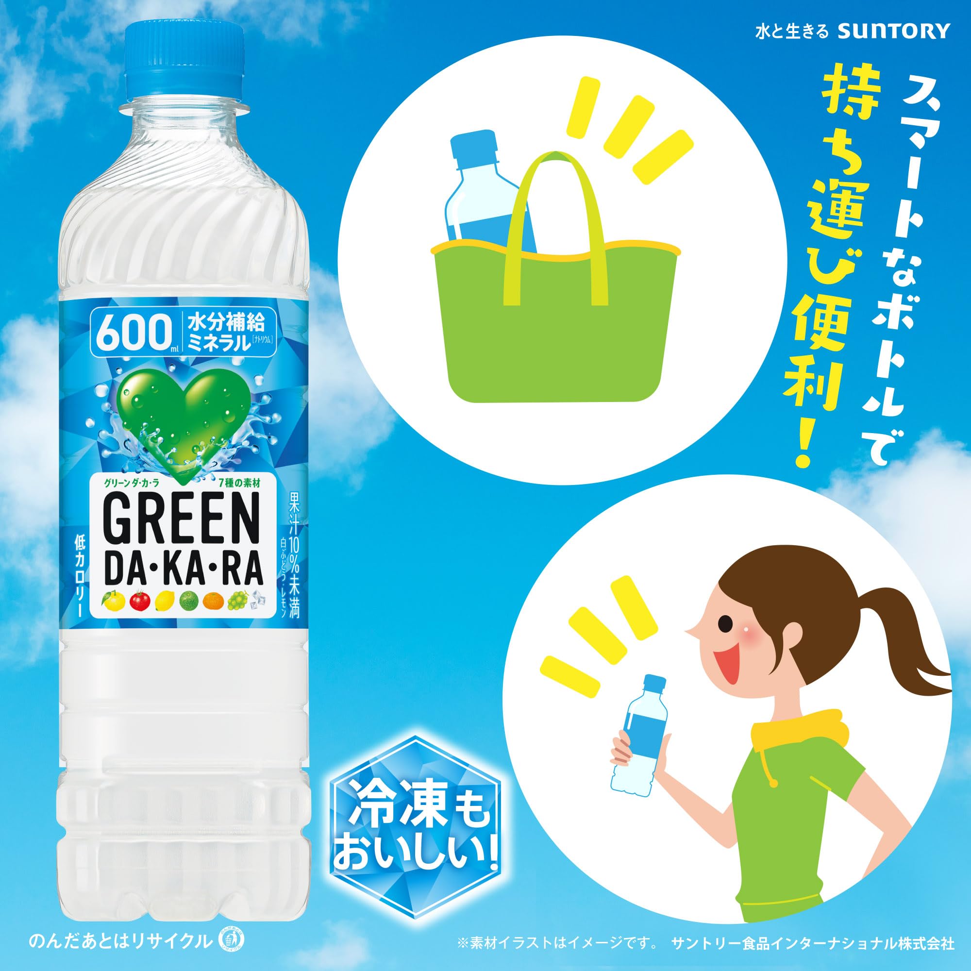 サントリー グリーンダカラ スポーツドリンク ペットボトル (冷凍兼用) 600ml×24本は、素材由来の自然な味わいで、カラダにうれしいすっきり果実の水分補給飲料です。日常生活やスポーツシーンでの熱中症対策設計(食塩相当量0.1g/100ml)と、水分補給に適した効率的な浸透圧設計(カラダと同じ浸透圧)。 2012年の発売以来、多くのお客様にご好評いただいている味わいをベースに、よりすっきりとした後味になりました。500mlより100mlもお得な600ml。「熱中症対策飲料」※としても推薦の商品です。