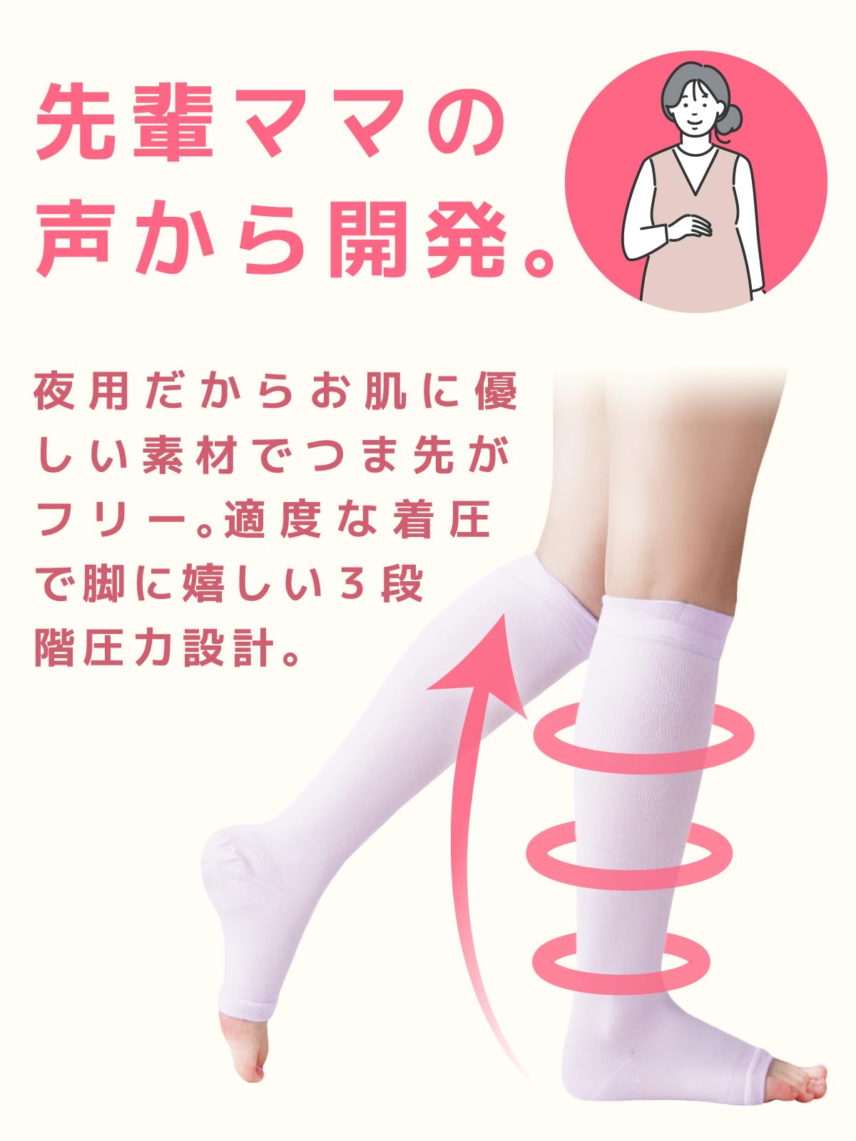 【高い伸縮性だからサイズ選びに悩まない】ひざ下・オープントゥタイプでつま先がないため、夜用にご着用いただけます。シルク混素材を採用しているため、寝る時だけでなく日中にも最適です。
