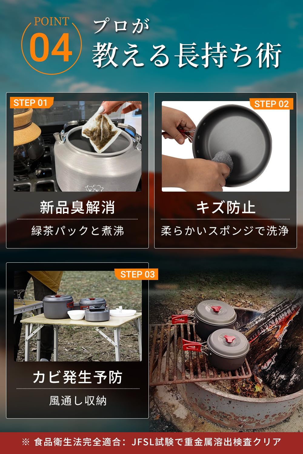 【耐久性の秘密】 航空機材レベルのハードアノダイズ加工を施したアルミ製。焦げ付き防止&耐衝撃設計で、岩場での使用にも耐える本格仕様。お手入れは中性洗剤で簡単クリーニング!