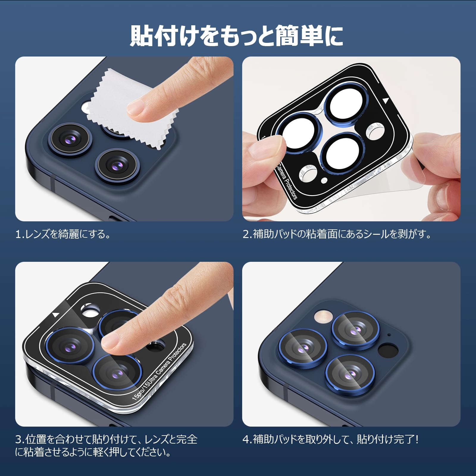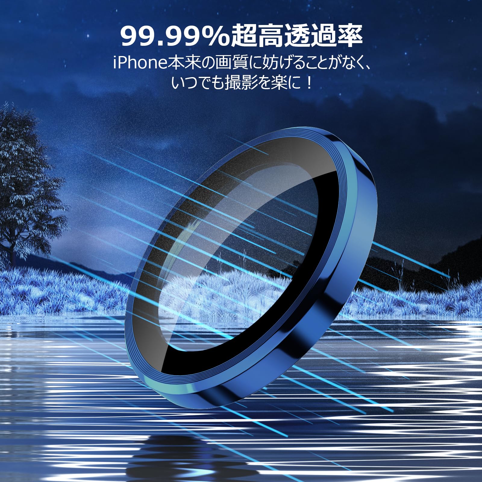 カメラフィルム iPhone 15 Pro/15 Pro Max用 カメラカバー 9H強化ガラス アルミ合金製 アイフォン15プロ/15Pro Max用 カメラ保護 キズ防止 耐衝撃 高透過率 黒縁取り 露出オーバー防止 極薄 カメラレンズカバー プロテクター ブルー