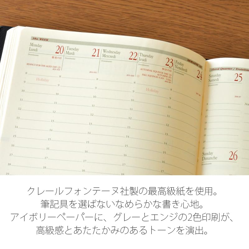 手に馴染むサイズに、曜日ごとに設けられたノートスペースが便利な手帳です。エレガントなアイボリーペーパー。