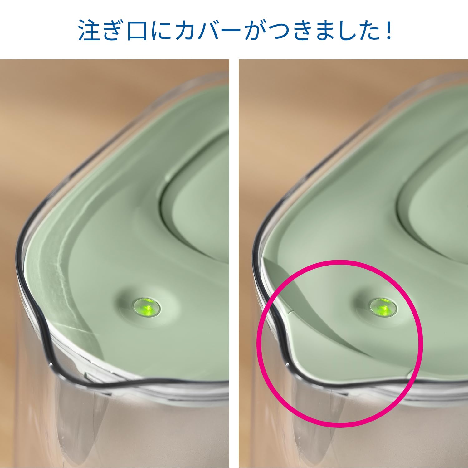 【ろ過水容量について】2020年10月1日の家庭用品品質表示法に係る雑貨工業品品質表示規程の一部改正にもとづき、定められた方法で測定した容量です。原水貯留部(ろ過される前の水道水が貯まる部分)の最下部まで貯留する水量を表示しています。