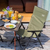 【三段階のリクライニング】ハイバックの背面が3段階にリクライニング可能のアウトドアチェア。シチュエーションに応じて好みのポジションでくつろげます。キャンプやバーベキュー、ピクニックで活躍します。
