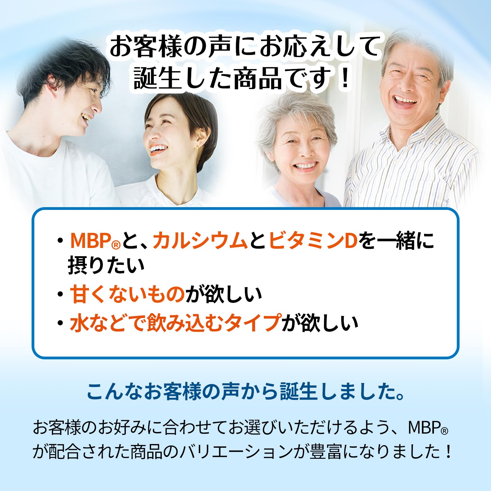 【お客様の声にお応えして誕生したサプリメント】「MBP(R)とカルシウム・ビタミンDを一緒に摂りたい」「甘くないものが欲しい」「水などで飲み込むタイプが欲しい」毎日すこやか MBR(R)Ca&ビタミンDは、こんなお客様の声から誕生しました。
