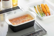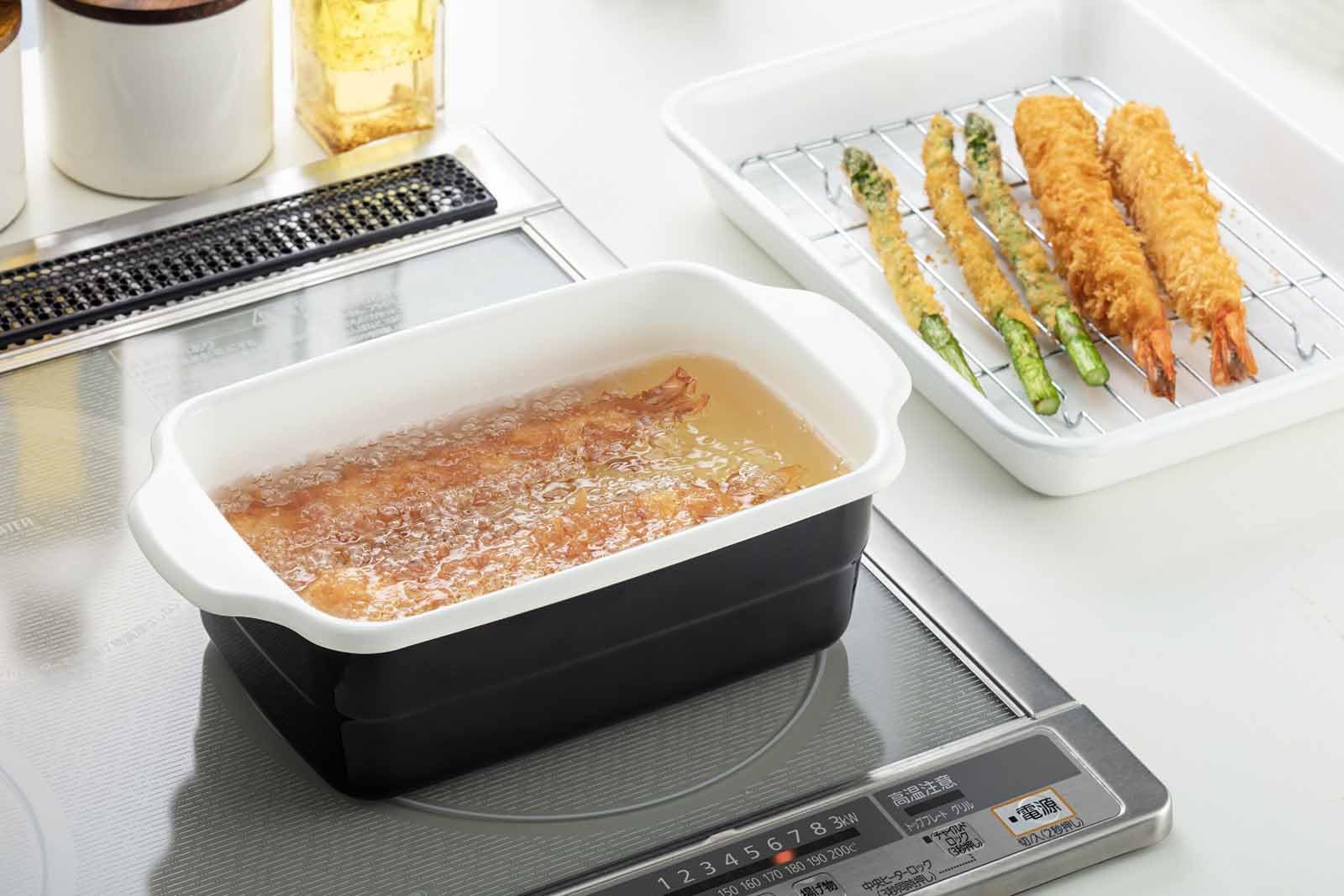 【角型天ぷら鍋は油の移し替え、収納にも便利】