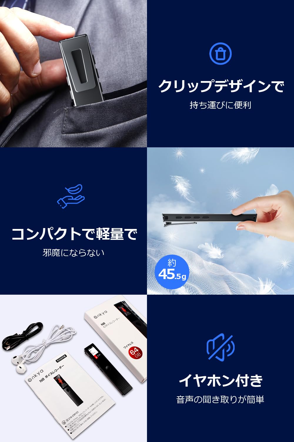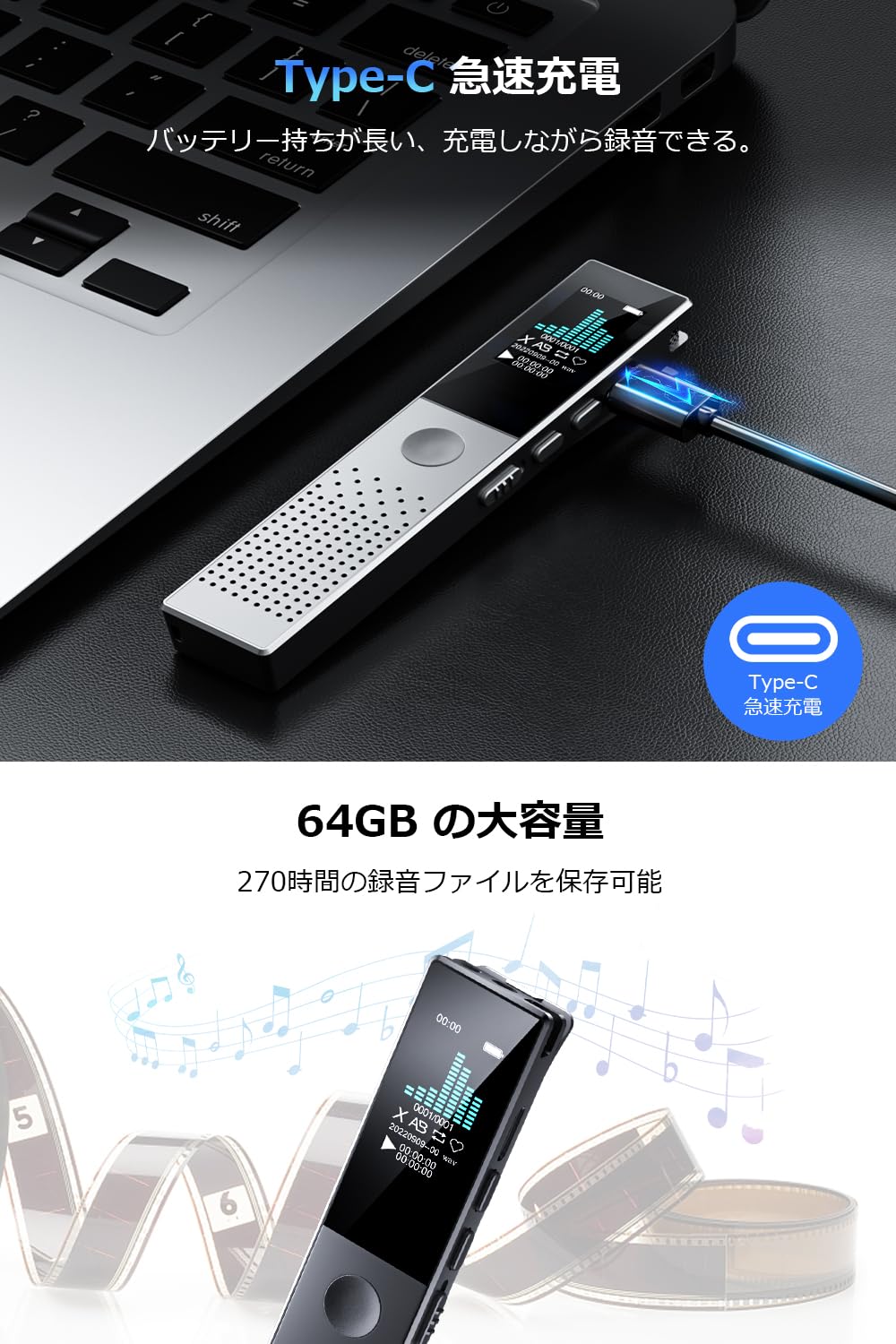ボイスレコーダー 小型 ICレコーダー 【2024新版 64GB大容量】 3072kbps音質 Bluetooth5.2技術 ENCデュアルマイク 長時間録音 コンパクト 録音機 ワンボタン録音 液晶画面 ヴォイスレコーダー VOR録音対応 タイマー録音 変速再生可 リピート機能付 スピーカー内蔵 パスワード保護 インタビュー/議事録作成/言語学習などに適用 イヤホン付 日本語説明書付