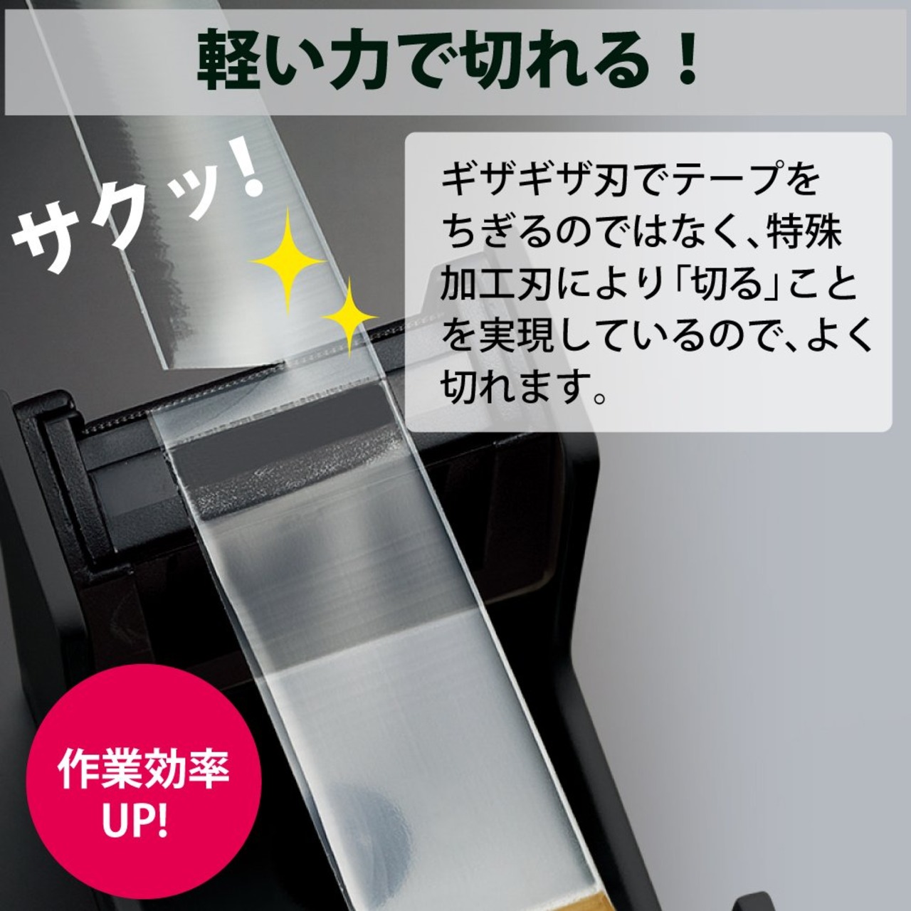 ●「カルカット」は、従来のギザギザ刃でテープをちぎるのではなく、カルカット独自の特殊加工刃に垂直にあたって「切る」を実現しているので、約1/2の軽い力でテープを切ることができます。(当社比)