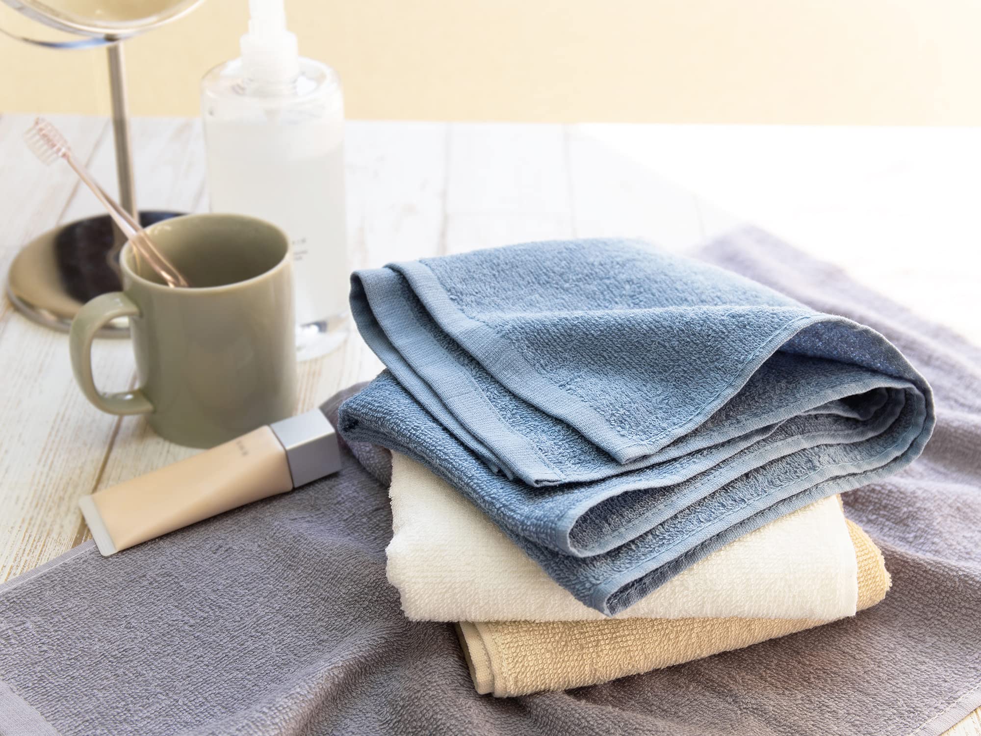 ・“この薄さが"普段使いに最適。軽くて扱いやすく、 使う場所を選ばないので、普段使いのフェイスタオルとしてはもちろん、薄手なので、お風呂などでも絞りやすく、体を洗うボディータオルとしてもお使いいただけます。