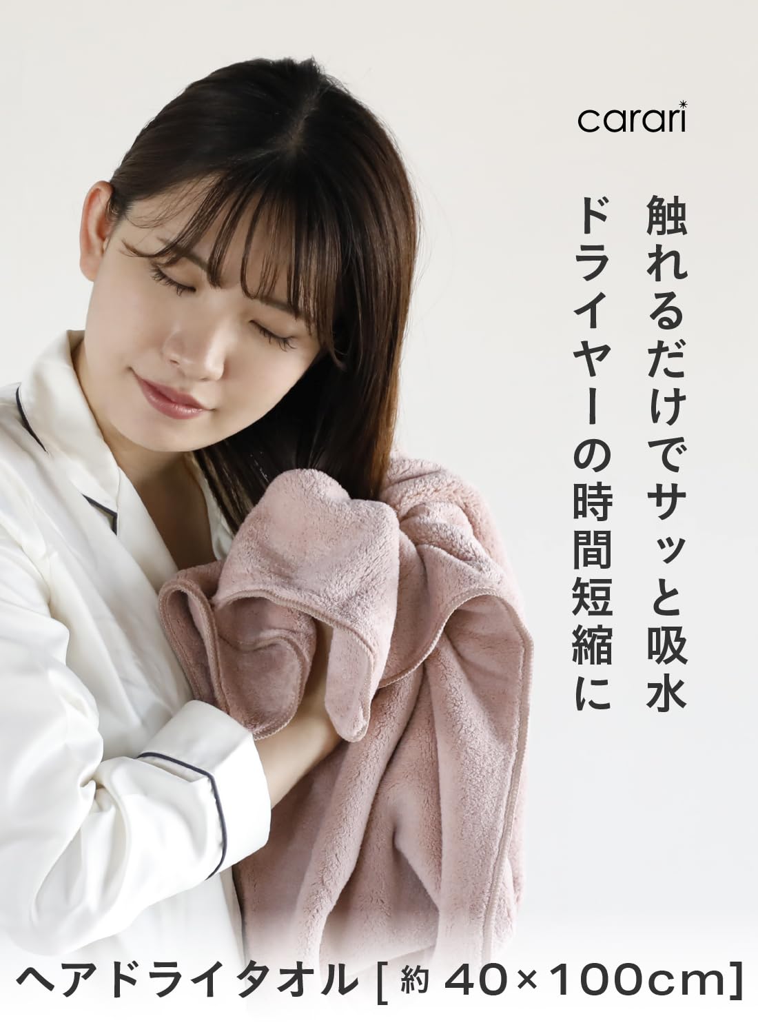 濡れた髪に軽く押し当てるだけで水分を吸収してくれるので、摩擦を減らしてダメージの軽減にも繋がります。ロングヘアの方のヘアドライはもちろん小さめのバスタオルとしても使えます。