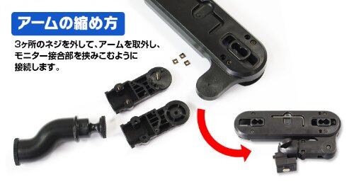 シャフトが太くて丈夫なので、10.1インチなどの大きなモニターでもしっかり固定できます。 またアーム長さを調節して、モニター位置を2パターンに調節することができます。