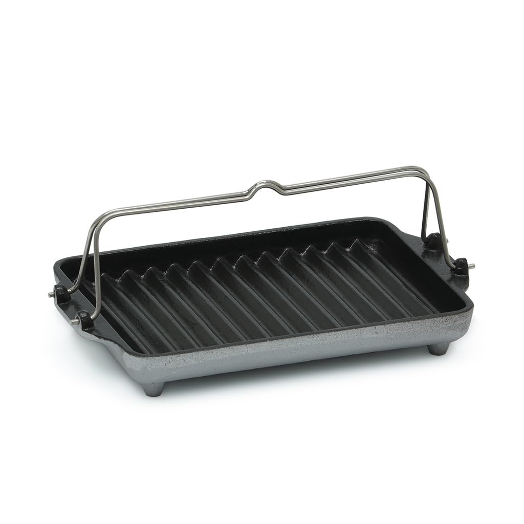 耐食性、熱伝導に優れ表面もこんがりおいしく焼けるアルミ鋳物製。黒メタリックのフッ素コーティングで焦げ付きにくく、波状の焼き面が余分な脂を落とします。火からサーブするのに便利なステンレス取っ手付き。