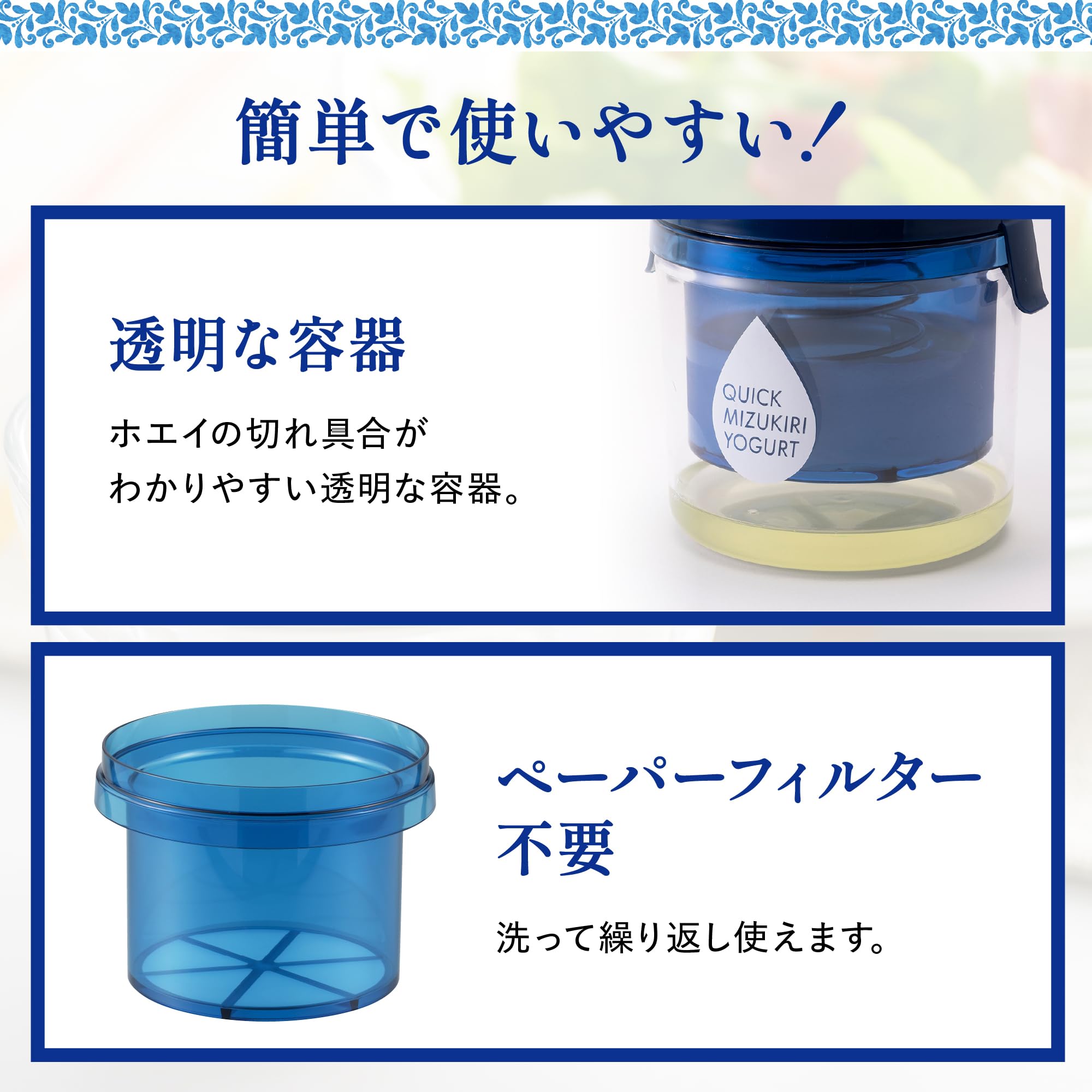 ・バネの力で快速水切り!ヨーグルトをセットして最短1時間で作れます。 ・ペーパーフィルタ不要で繰り返し使えます。 ・ゆるめにしてドレッシングやソースにしたり、かためにしてチーズのような食感を楽しんだり、時間調節でアレンジできます。 ・ゼラチン・寒天等が使用されているヨーグルトは水切りできません。
