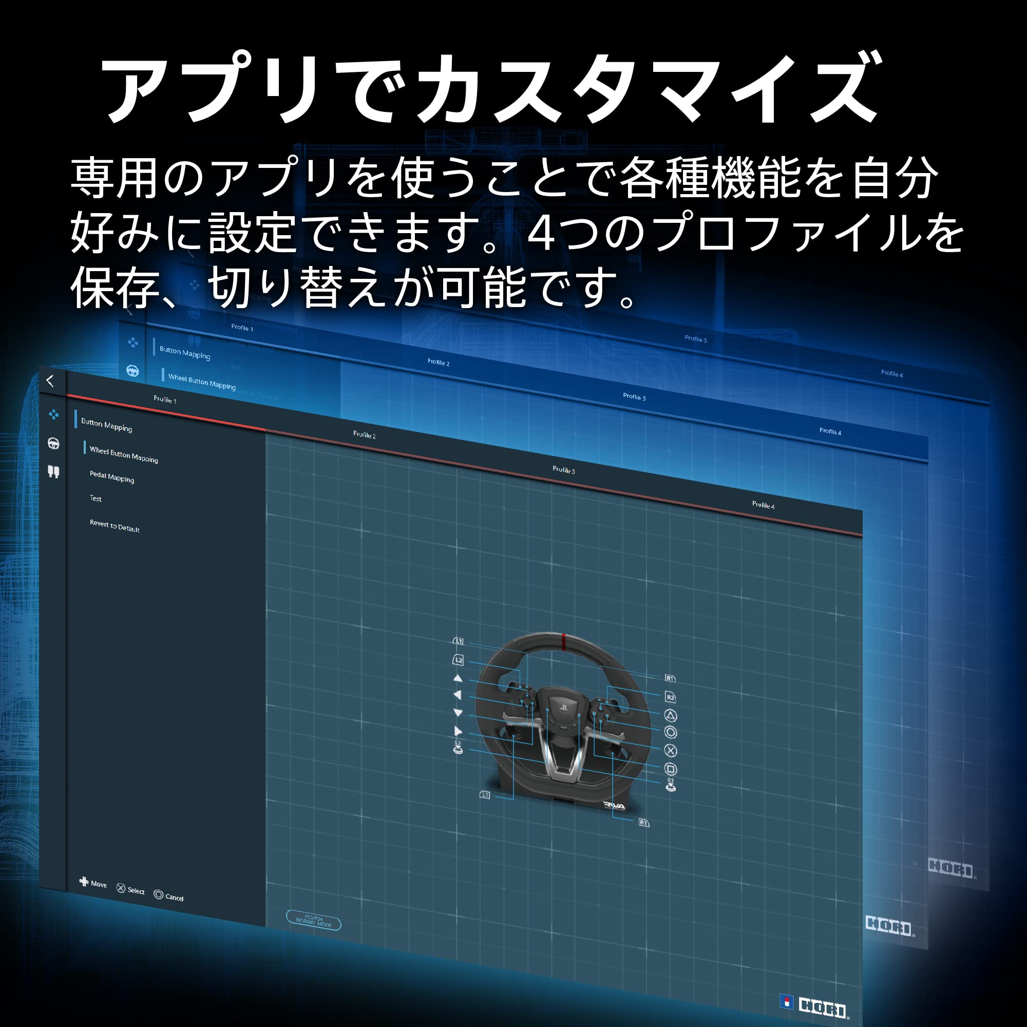 専用のアプリを使う事で各種機能を自分好みに設定できます。ボタンアサイン・デッドゾーン調整・ペダル感度調整・プロファイル保存が行えます。