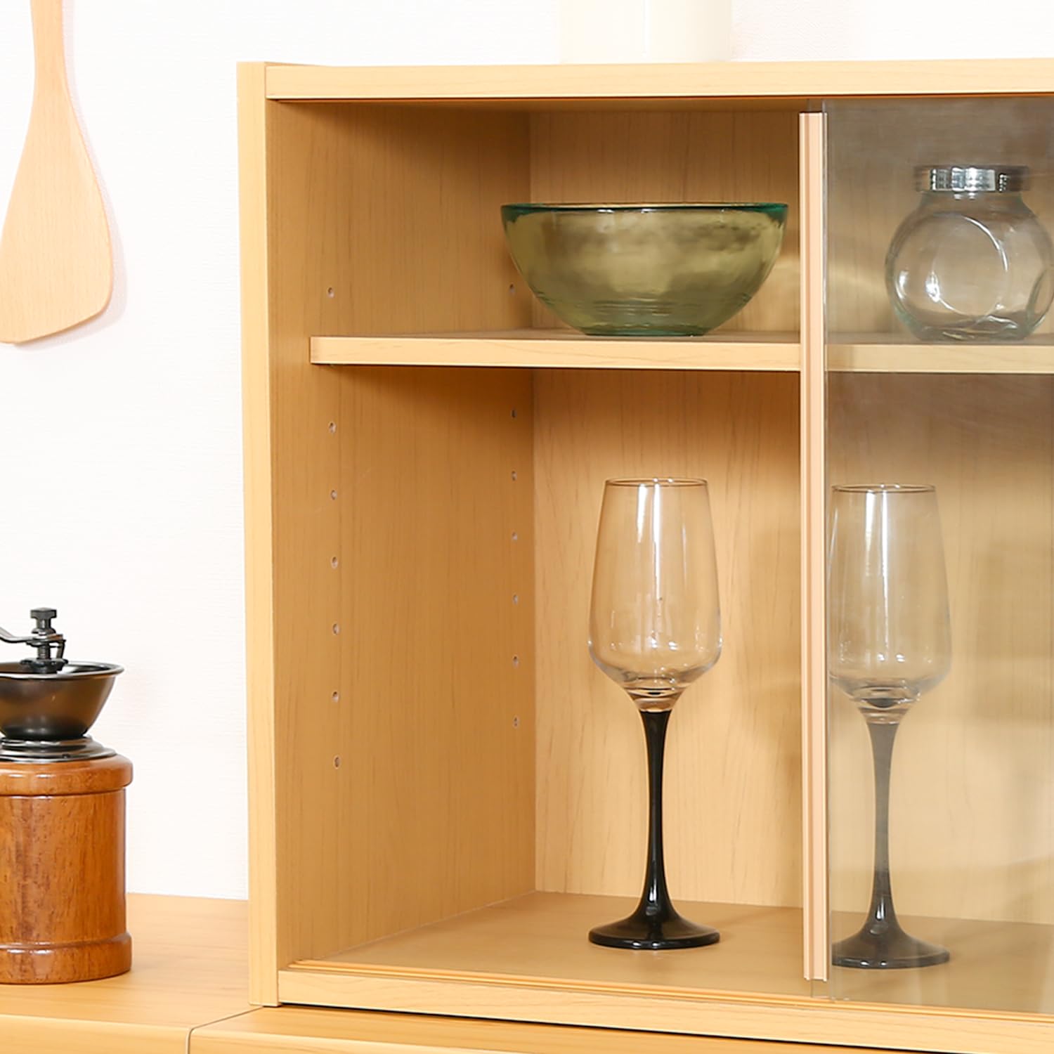 棚板は8段で調節できる可動棚で、平たいお皿から背の高いコップまでしっかり収納できます。