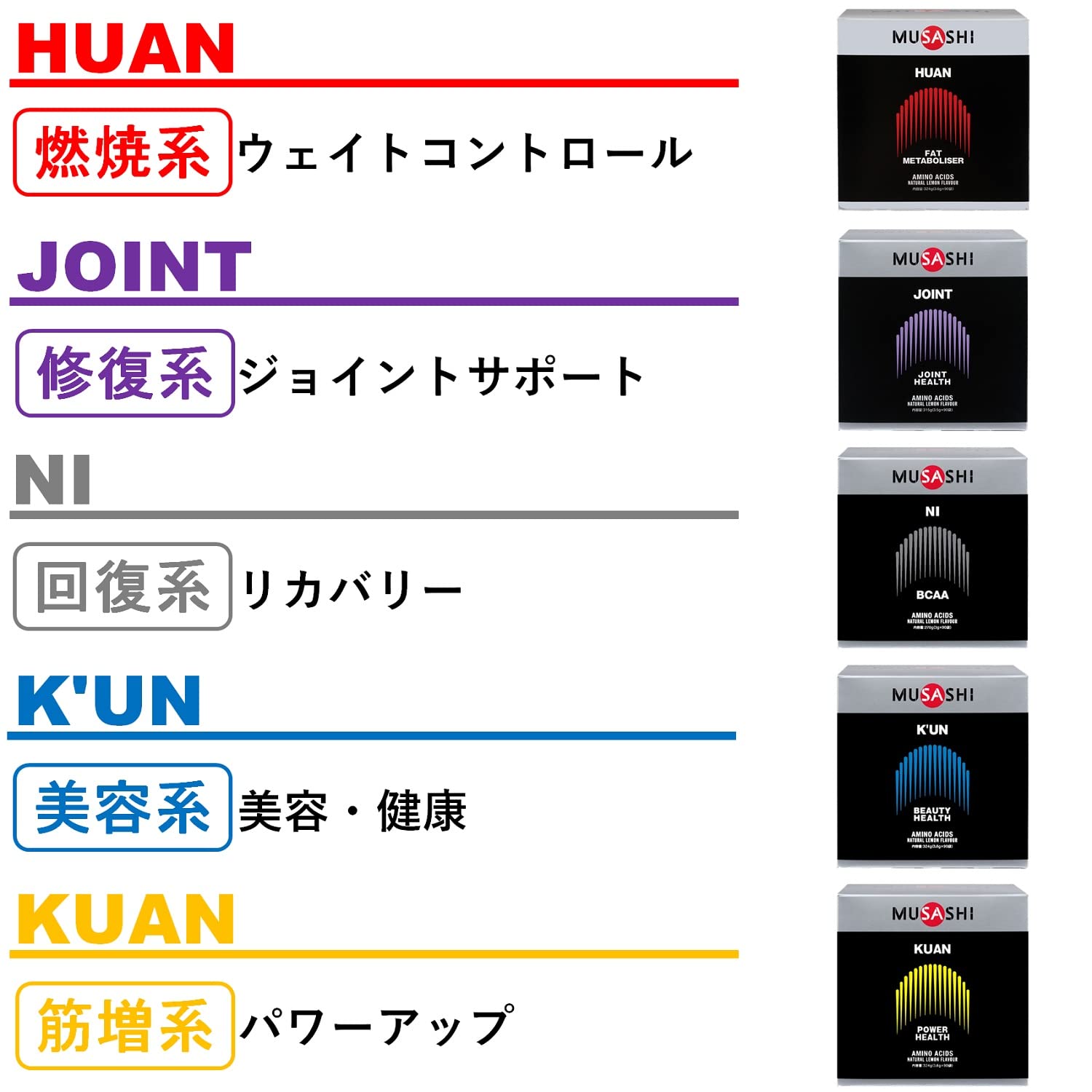 HUAN(フアン)には、運動による脂肪の利用に役立つアミノ酸等が含まれ、健康的なウエイトコントロールとボディメイクをサポートします。