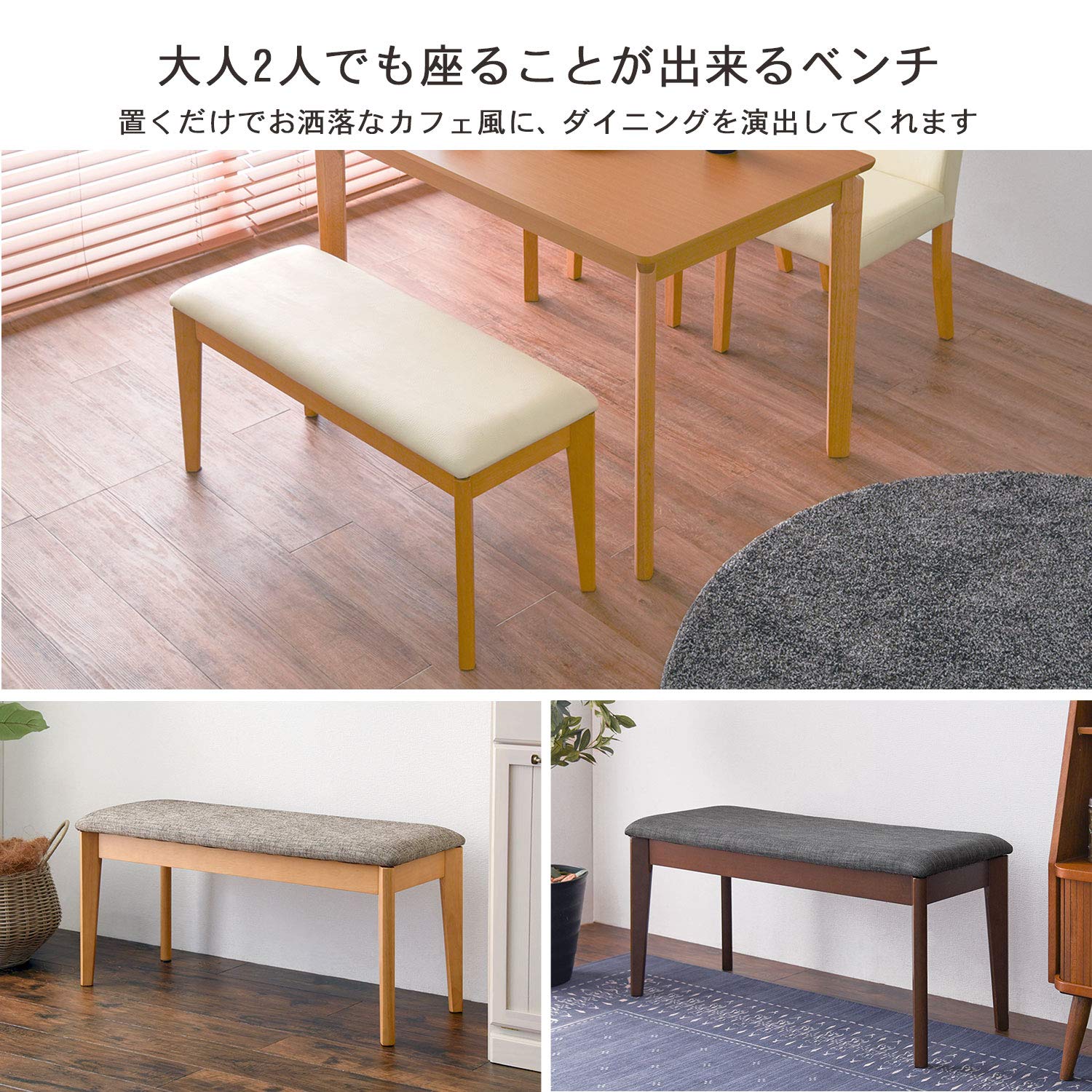 撥水性の高いPVC生地を使用し、水や食べこぼしもサッと綺麗にお掃除できるダイニングベンチ。大人2人でも座ることができ、置くだけでおしゃれなカフェ風にダイニングを演出してくれます。