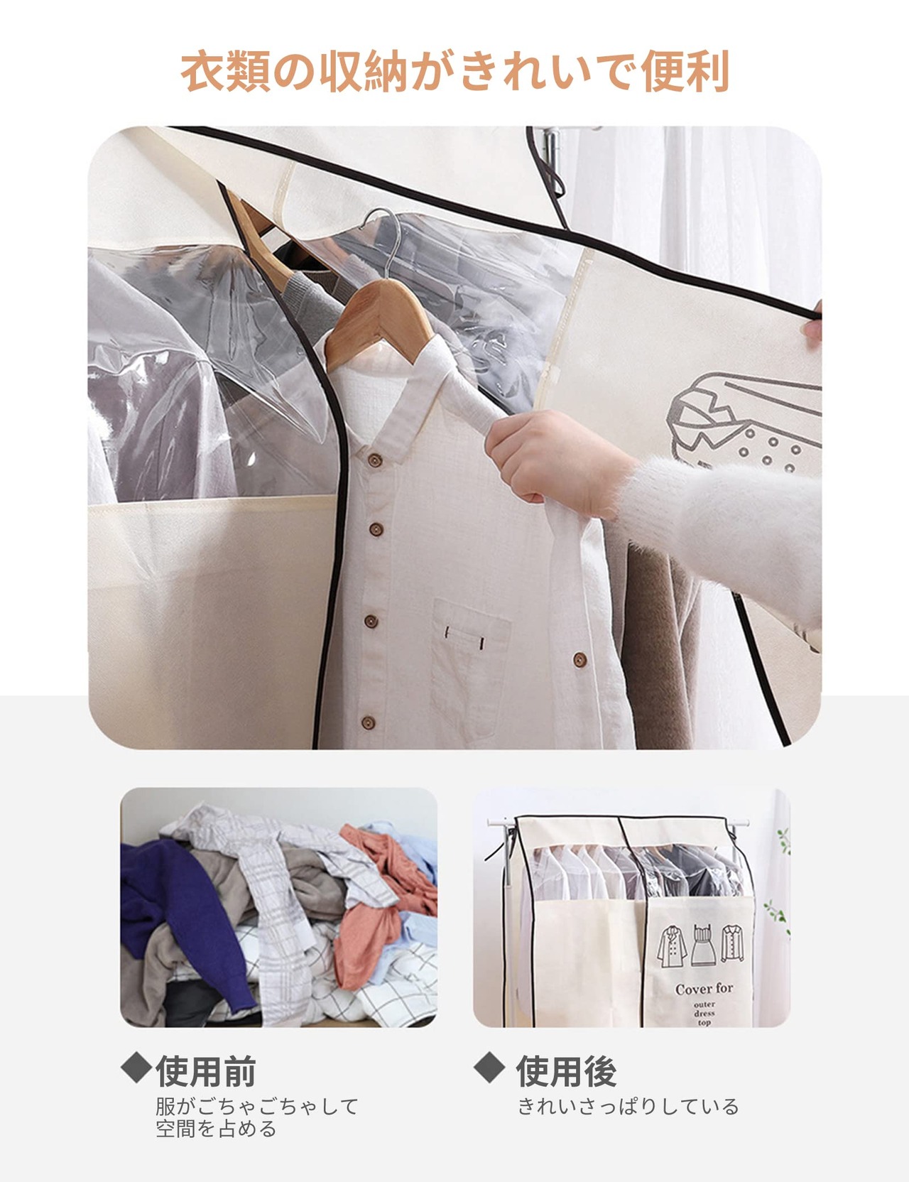 【確認し易い透明窓付き】衣類カバーの上端には透明の窓が設けられており洋服カバーの内にある内容を一目で確認する事が可能です、いちいちカバーを開けて探さなくともよいです。透明の窓部分はビニル材質なので拭きやすく手入れもし易いです。