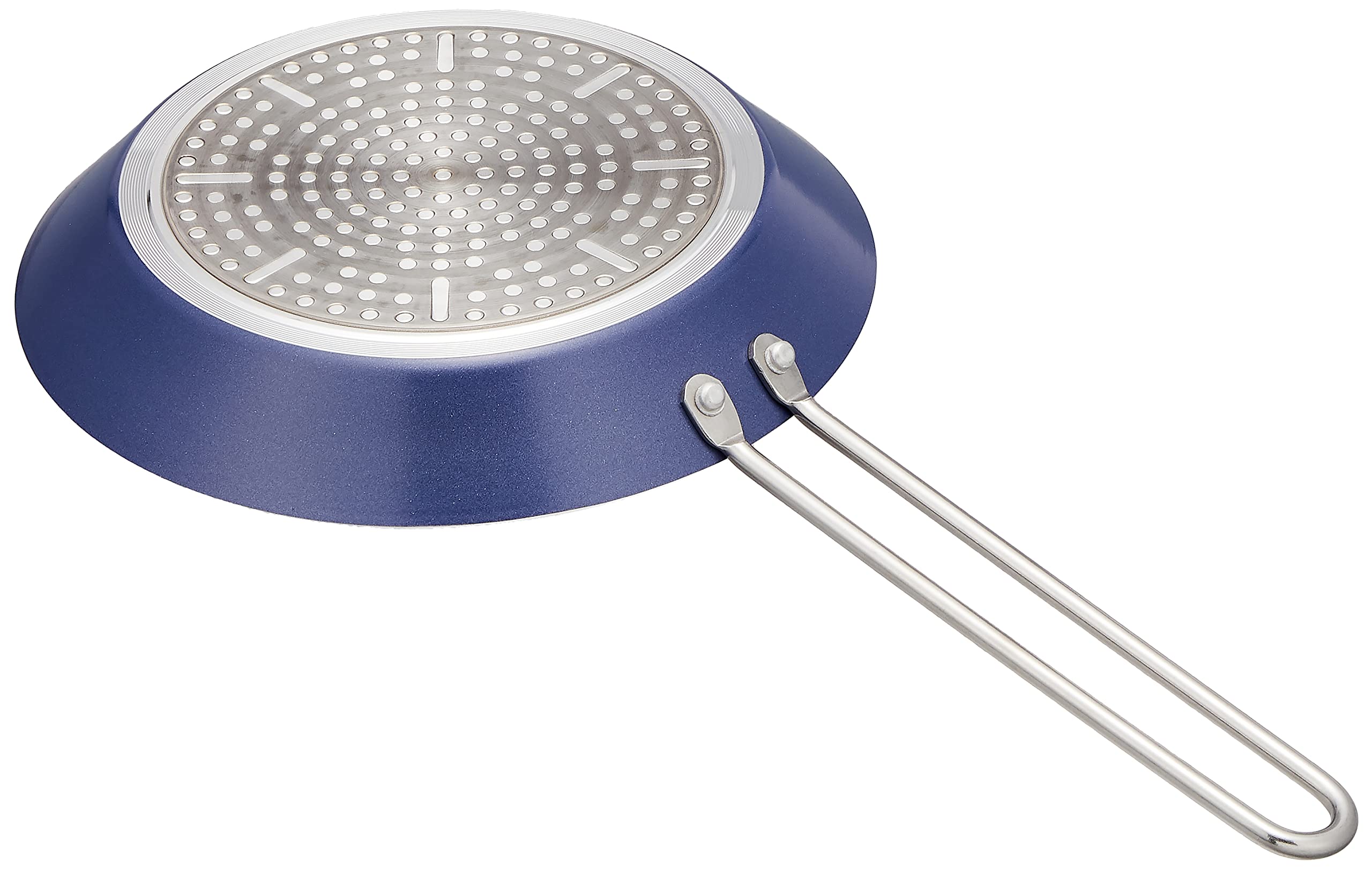 ●油なじみが良くコゲつきにくいフッ素樹脂加工を施し後片付けもラクラク。アルミ厚板2.6mmを使用しているので、熱ムラが少なく変形しにくいので長く使える。モダンなキッチンに似合うクールなブルーメタリック