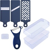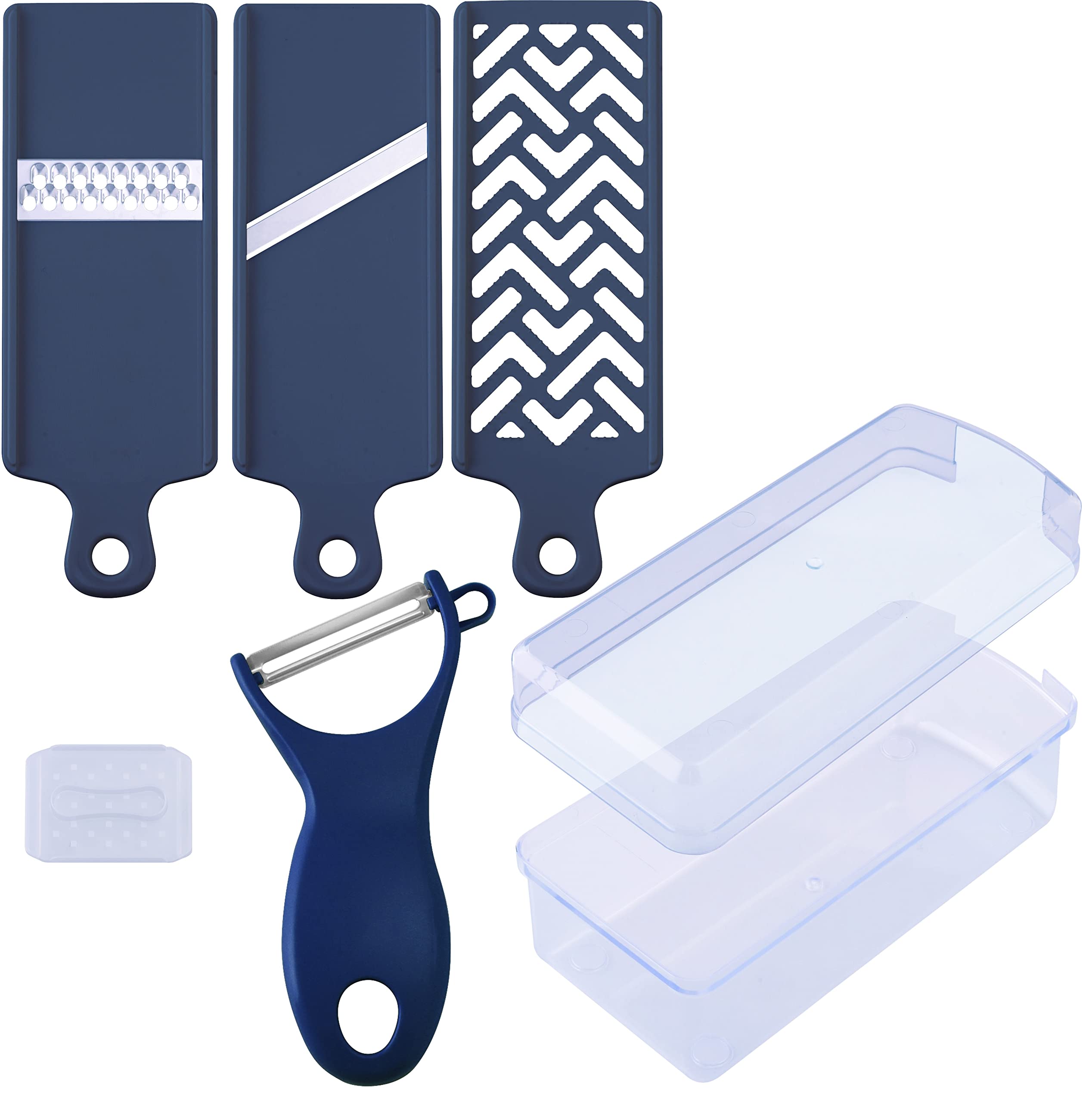 千切り、平切り、おろしのプレート3枚とピーラー、安全ホルダー、ケースとカバーが付いたお買い得7点セット。引出にコンパクトに収まるサイズ感で場所をとりません。