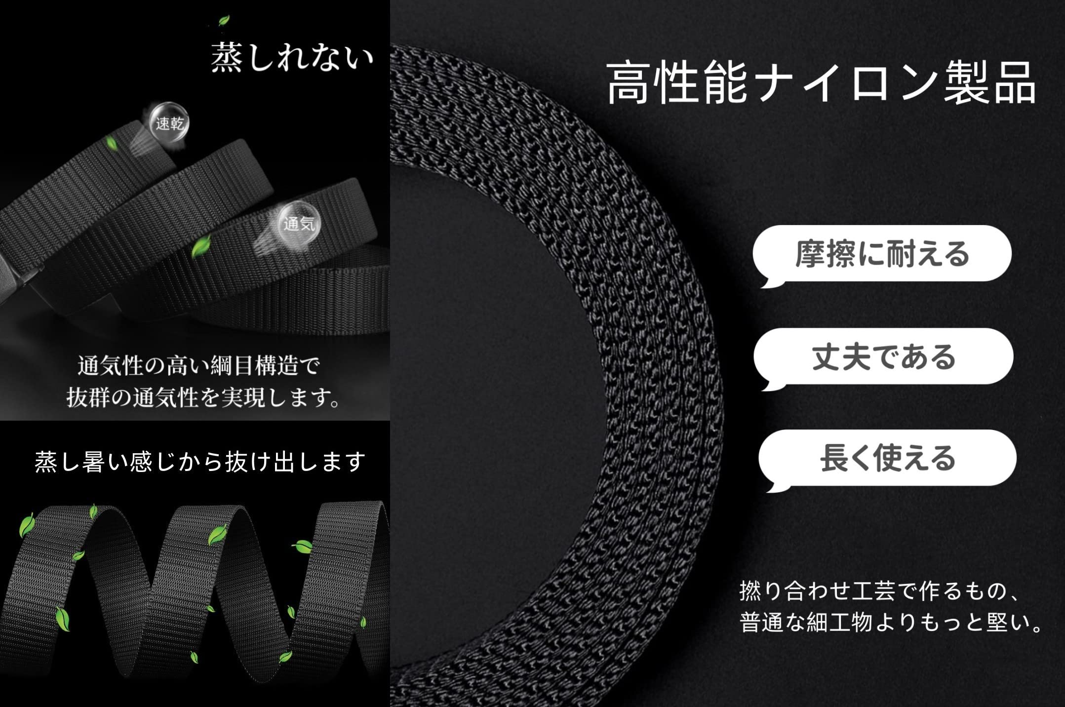 【素材】ベルト部分は布より耐久性が高い高品質ナイロンを使用。またバックル部分はYKK製の強化樹脂で仕上げました。