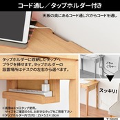【タップホルダー/コード通し付き】天板下にはタップホルダーを付けることができ、組立の際に左右設置が選べます。天板にコード通しの穴が開いているので、机上のライトやスマホ、タブレット、PC等の充電・給電ケーブルをコード通しからタップホルダーへとすっきり通すことができます。