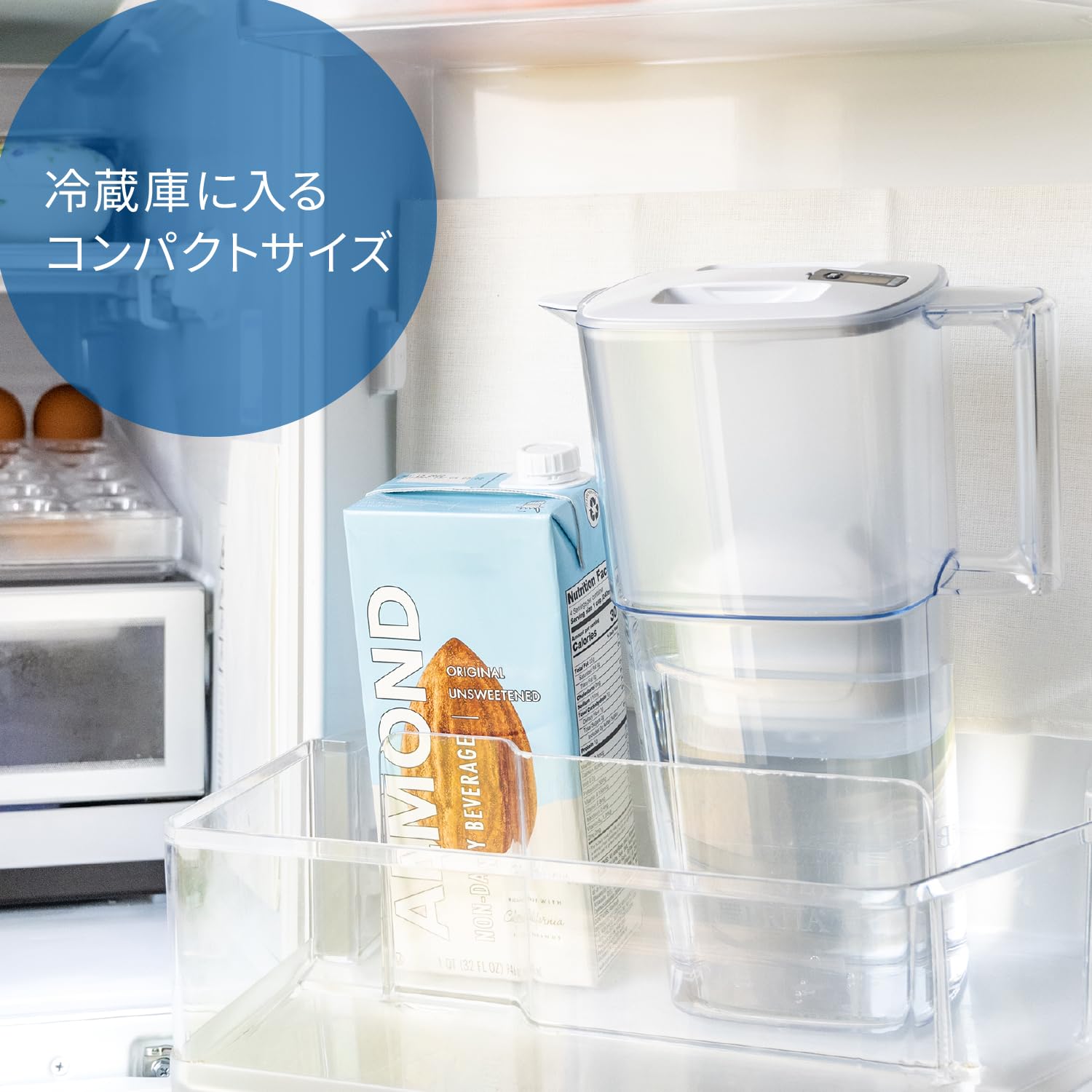 【ろ過水容量について】2020年10月1日の家庭用品品質表示法に係る雑貨工業品品質表示規程の一部改正にもとづき、定められた方法で測定した容量です。原水貯留部(ろ過される前の水道水が貯まる部分)の最下部まで貯留する水量を表示しています。