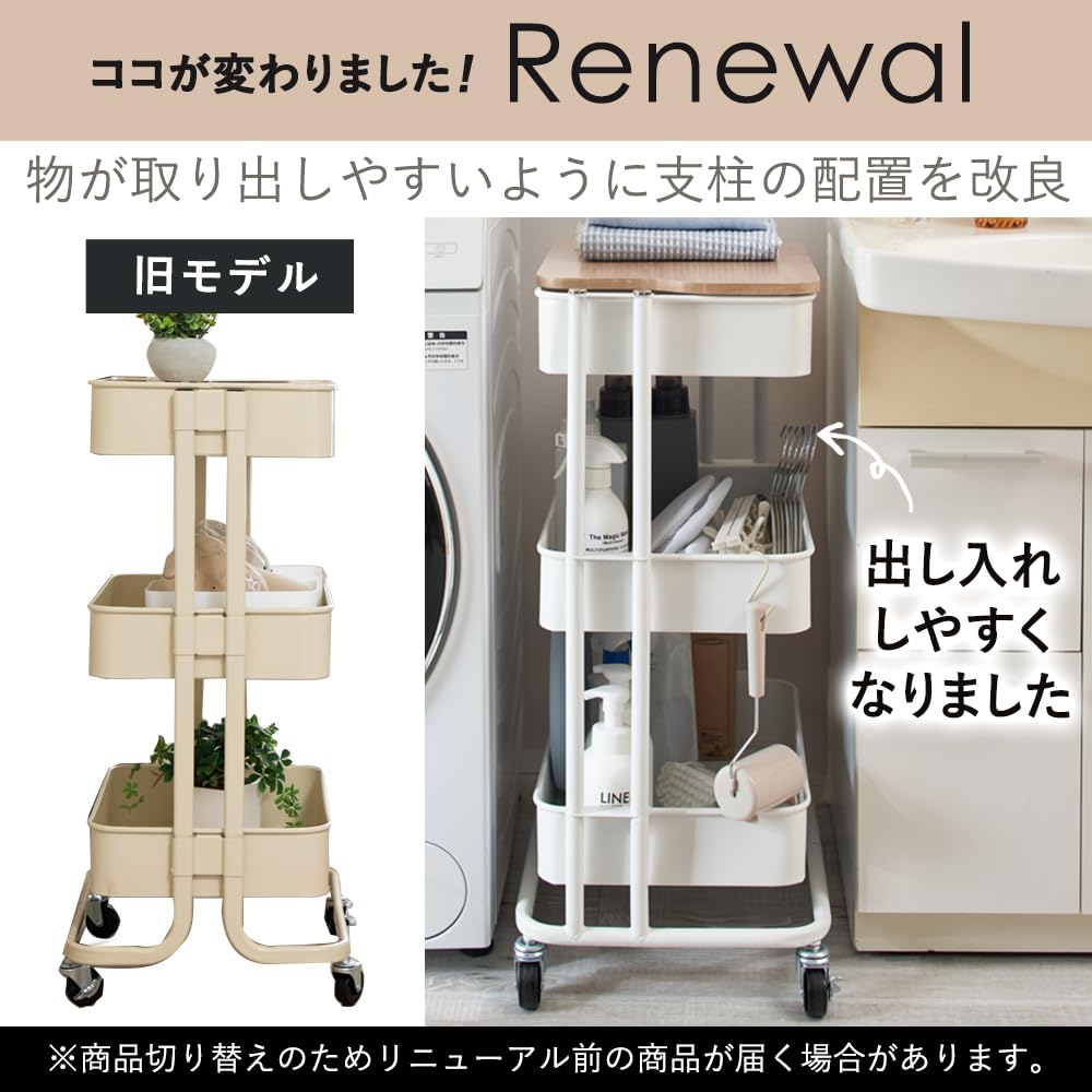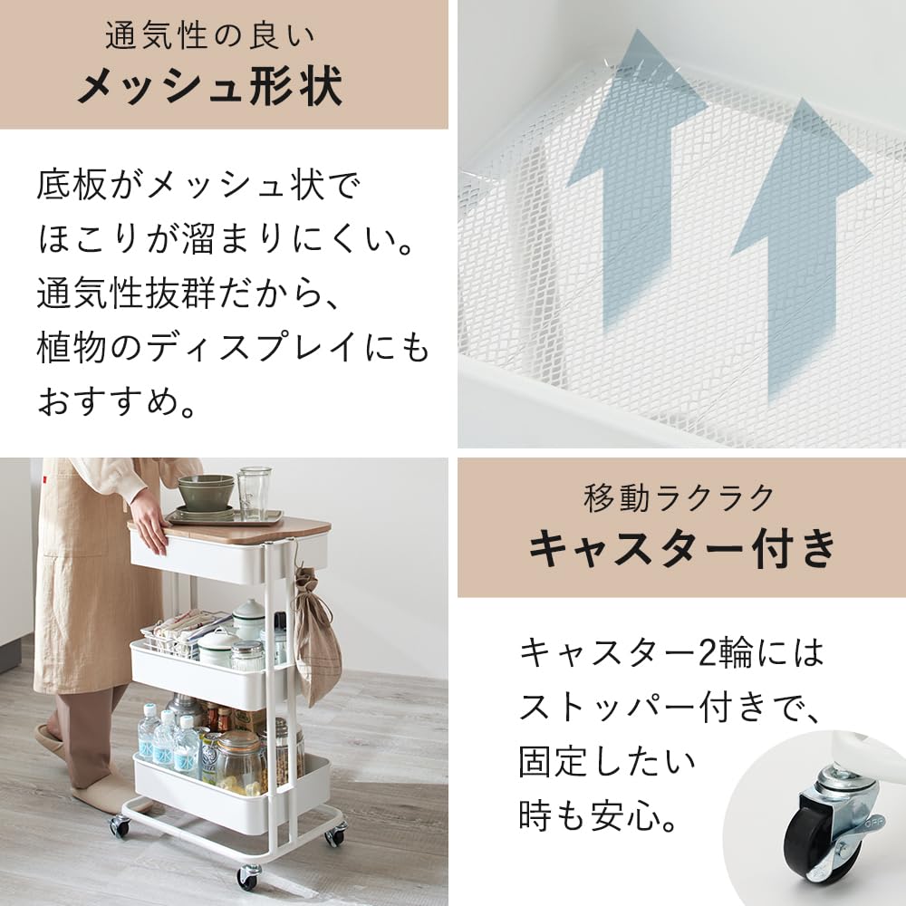 【取り出しやすくリニューアル! 】アイリスプラザ キッチンワゴン 調味料ラック バスケットラック 木天板タイプ 収納ワゴン 3段 キャスター付 幅44.5×奥行35×高さ78cm ホワイト KW-L002