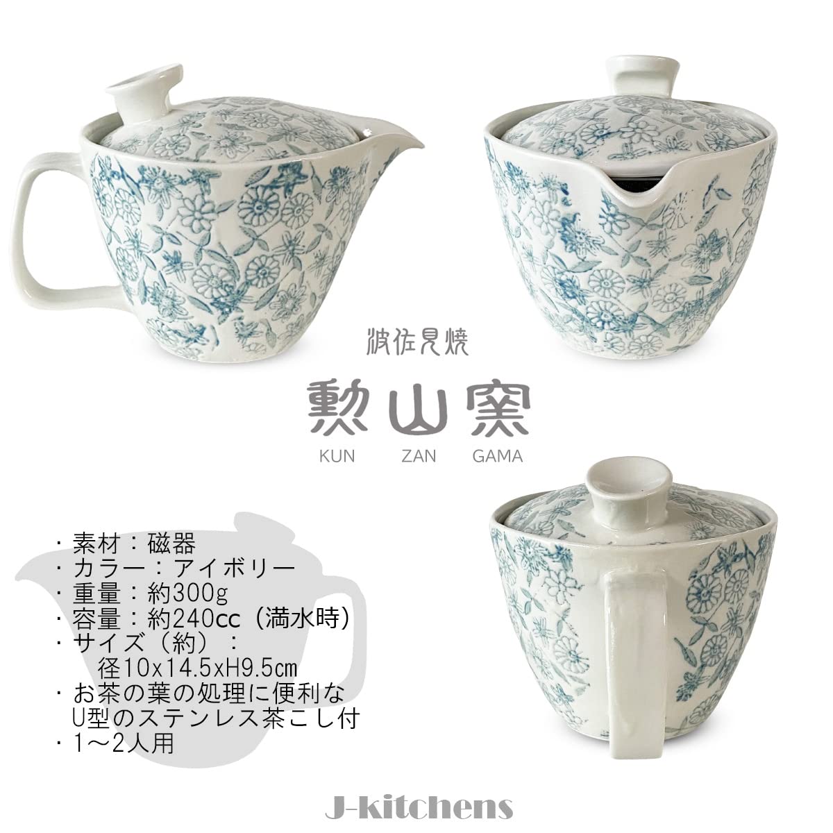 ジェイキッチンズ(J-kitchens)急須 茶こし付き 240ml 1人用 ~ 2人用 波佐見焼 日本製 撥水更紗紋 ポット S ライトブルー