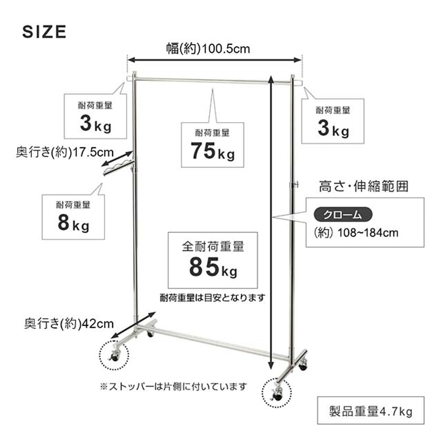 耐荷重(kg):全耐荷重:約85kg、ハンガーパイプ:約75kg、サイドフック:約3kg (2本付)、斜めフック:約8kg