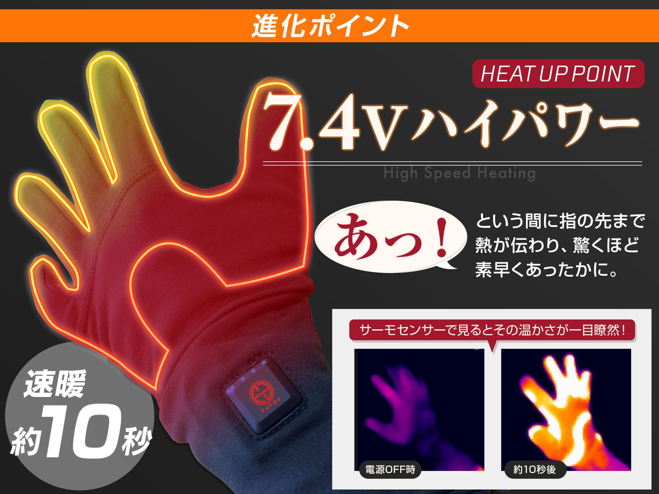 ■【ブーストモード搭載】これまでの3段階温度に加え、さらにあったかいブーストモード搭載! ■【包まれるような温かさ】手の甲にも電熱線を配置し改良することで、手の甲から指先までしっかり温まるようになりました。 ■【伸縮性の高いインナータイプ】お好きな手袋やグローブの中に着用できるよう、薄手で伸縮性の高い生地を採用しております。 ■【電熱線断線防止加工】従来品は電熱線が加工されておらず、断線し使えなくなったり効果が落ちたりしてきます。当製品は電熱線を引っ張りに強い加工を施し、耐久性も向上しました。