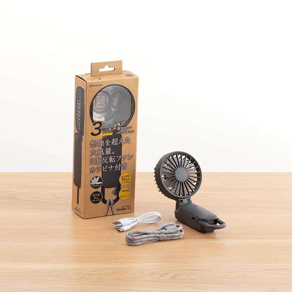 リズム(RHYTHM) ハンディファン 2025 大風量 静音 3WAY (手持ち 首掛け 卓上) [国内メーカー] 風量5段階 Type-C対応 カラビナ&ストラップ付き 小型 携帯扇風機 Silky Wind Mobile 3.2 ダークグレー 9ZF040RH82 | kor Cat*