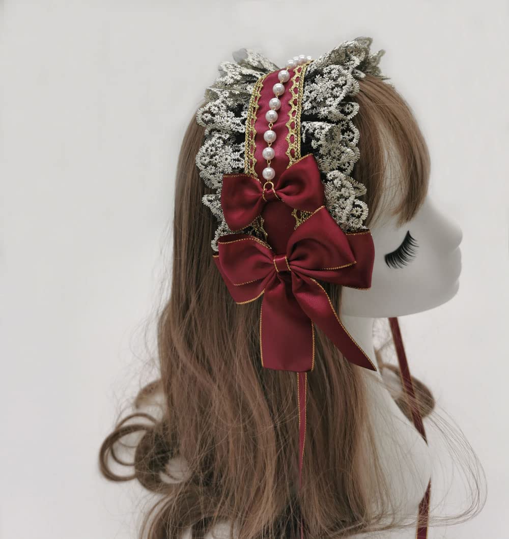 手作り ゴシック式ロリータ コスプレ カチューシャ。頭飾りの後ろに2つの隠されたヘアピンがあります。 光沢のあるリボン、絶妙な手作りのビーズチェーン、かわいいダブルボウ、レース、繊細なアイボリーホワイトのトリムで縁取られた暗黒系ロリータヘアアクセサリー。