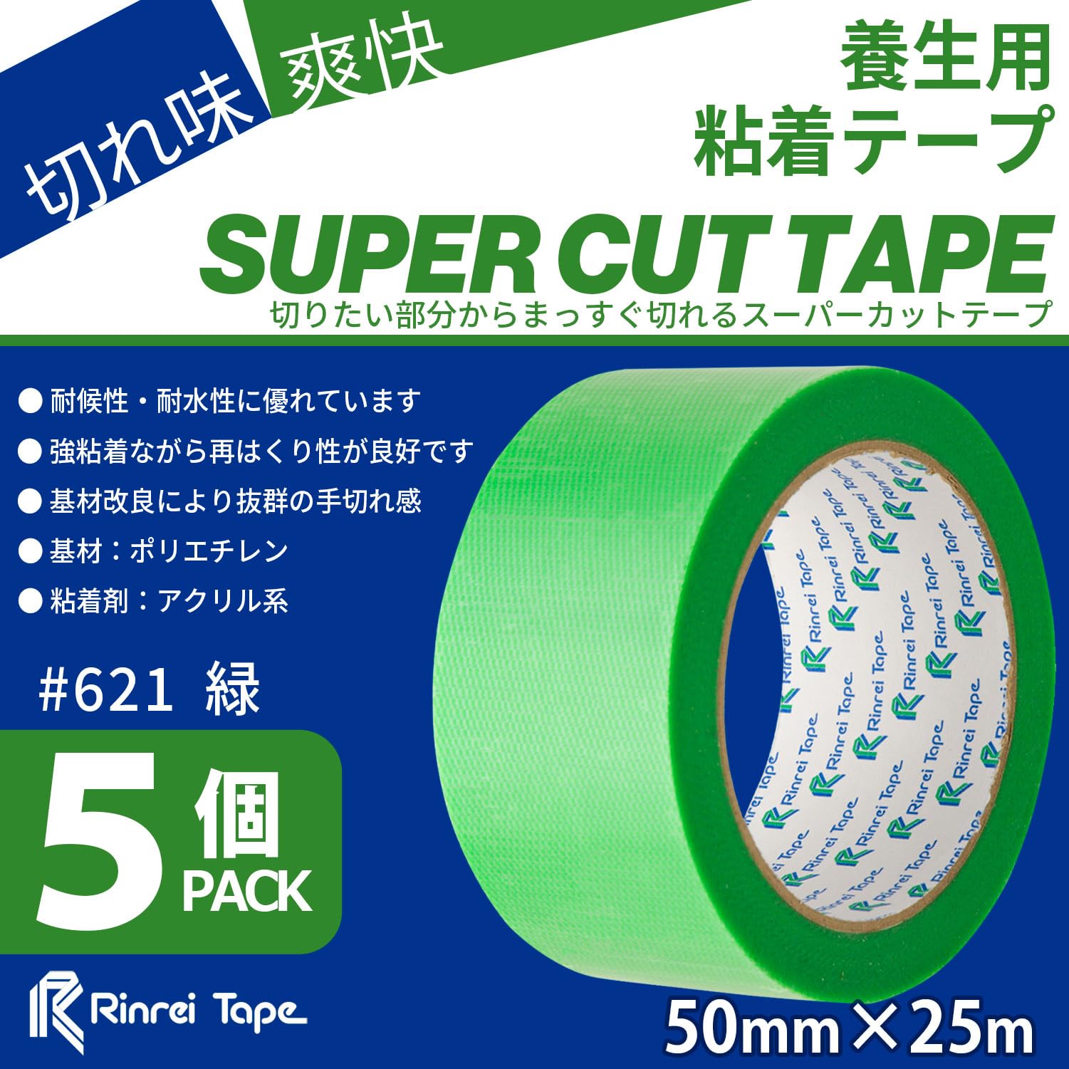 リンレイテープ 養生テープ PEテープ 50mm×25m 5巻 緑 621_5