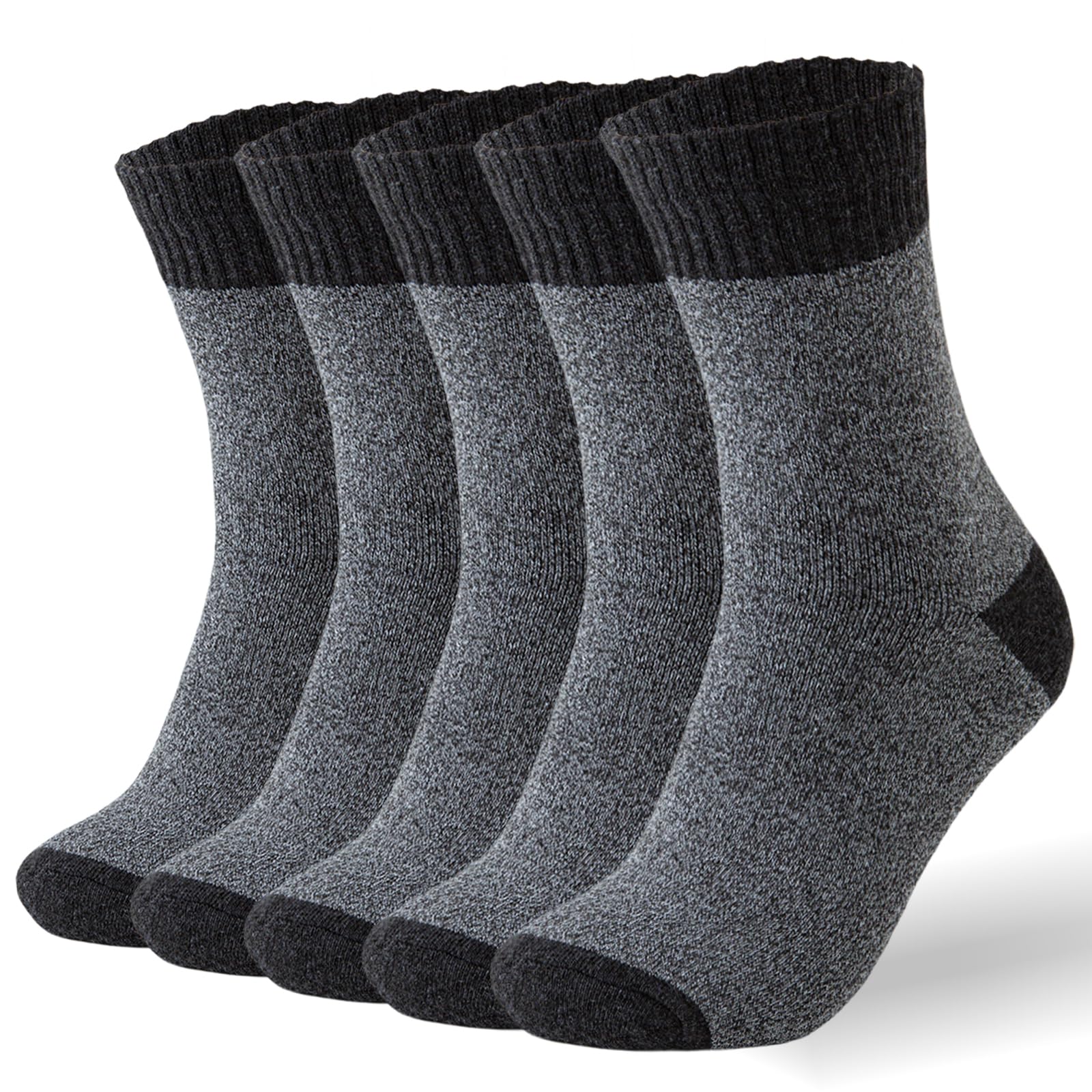 【厚くて暖かいウール靴下】MOSOTECH 5ペアの メンズサーマル靴下は、厚く、柔らかく、快適で、通気性、耐摩耗性、吸汗性に優れた高品質のウールとポリエステルの混紡で作られています。 メンズの厚手の靴下は各ペアが厚く、寒い冬に十分暖かいです。 フリーサイズでほとんどの メンズにフィットします: サイズ: 24-28cm。