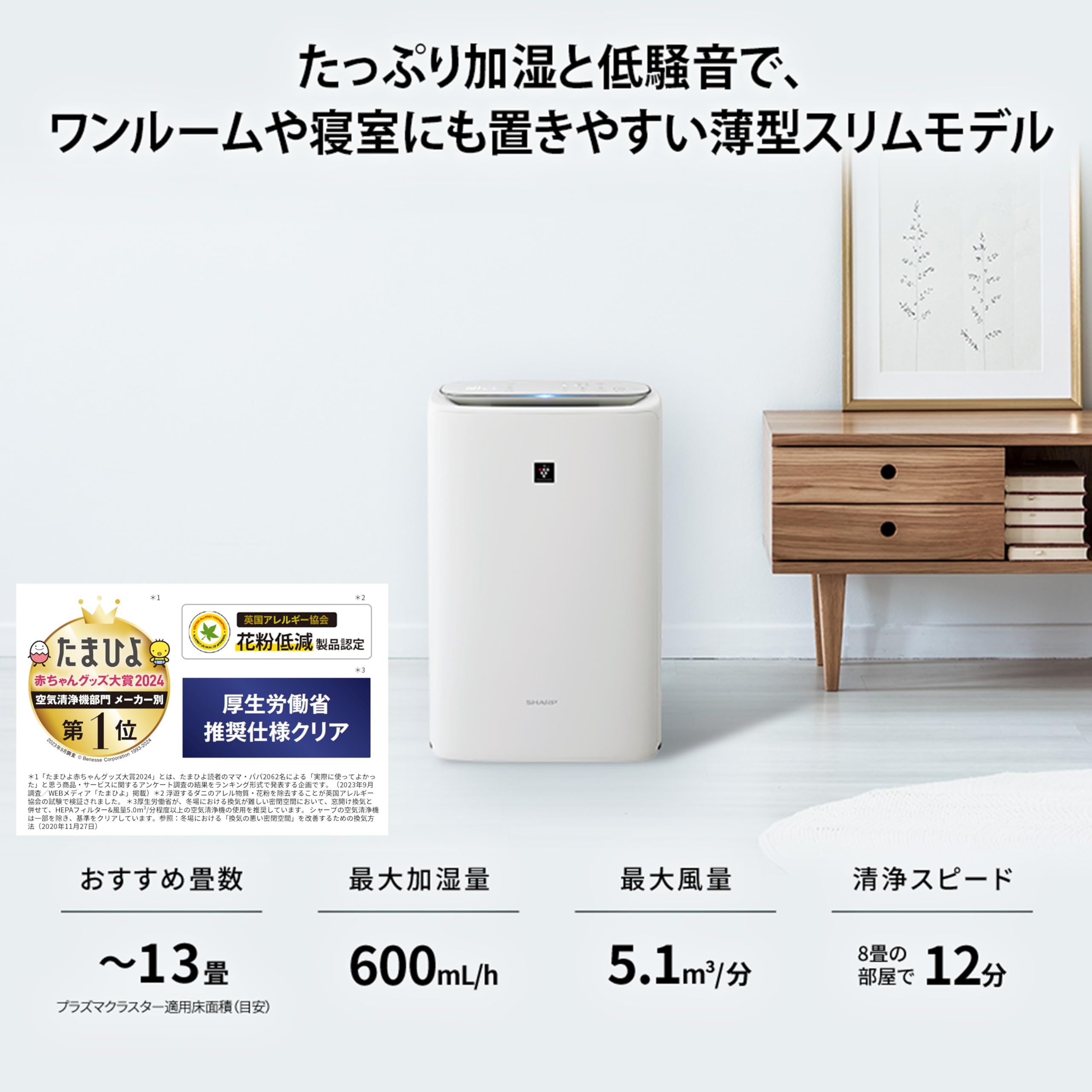 ・シャープ独自の空気浄化技術、プラズマクラスター25000を搭載しています。・プラズマクラスターは「+」と「-」両方の静電気を除去できるので、 花粉や微小な粒子が壁などへ付着するのを抑制します。・外から持ち込みやすい花粉。プラズマクラスター空気清浄機なら、フィルターで取れない付着した花粉アレル物質をしっかり抑制します。・プラズマクラスター空気清浄機の特長である、お部屋全体に風の流れが素早く行き渡るスピード循環気流。遠くのホコリも引き寄せて大きな背面全体の吸込口でパワフルに吸引します。プラズマクラスターイオンが静電気を除去しながら、効率良く集じんします。・二層構造の加湿フィルターでたっぷり加湿・二層構造加湿フィルターを搭載することで、加湿「強」運転時でも運転音は従来より9dB低い、低騒音と呼べる43dBを実現しました。実際の使い勝手にこだわり、これまで以上に快適にうるおい空間を目指します。・生活導線を邪魔しにくい奥行230mmの薄型設計なので、壁際にもスッキリ設置できます。・お部屋のお掃除の時など、片手で簡単に移動可能。また、ストッパーで固定もできるので、小さなお子様のいるご家庭でも便利です。