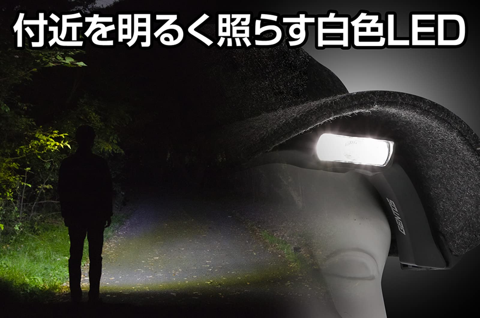 機能:1m落下耐久、防滴仕様 (IPX4準拠)、最大照射距離:約38m