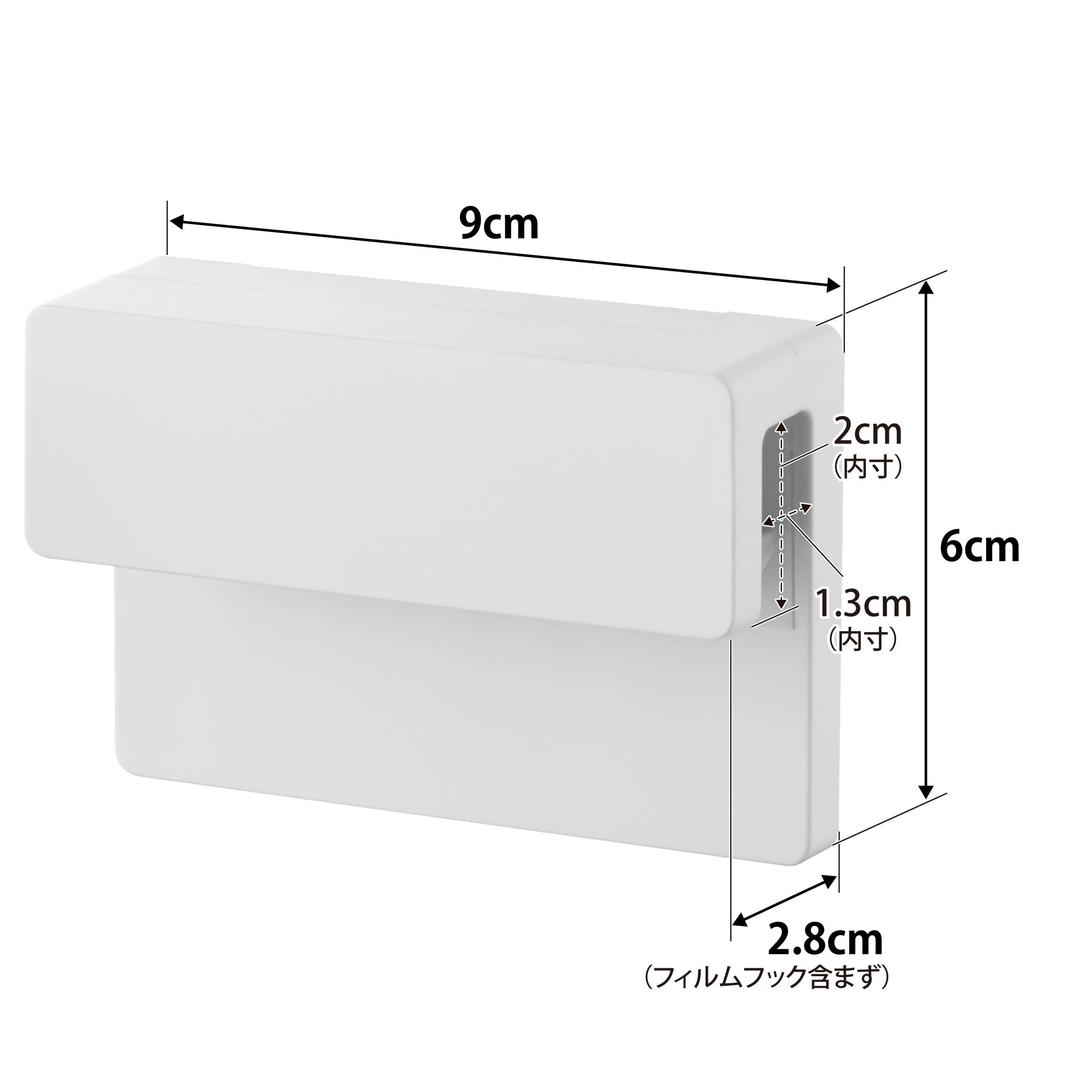 商品サイズ 本体:W9×D2.8×H6cm(フィルムフック含まず) フィルムフック接着面:W6×H6cm ▪商品重量:50g ▪内寸:W9×D1.3×H2cm