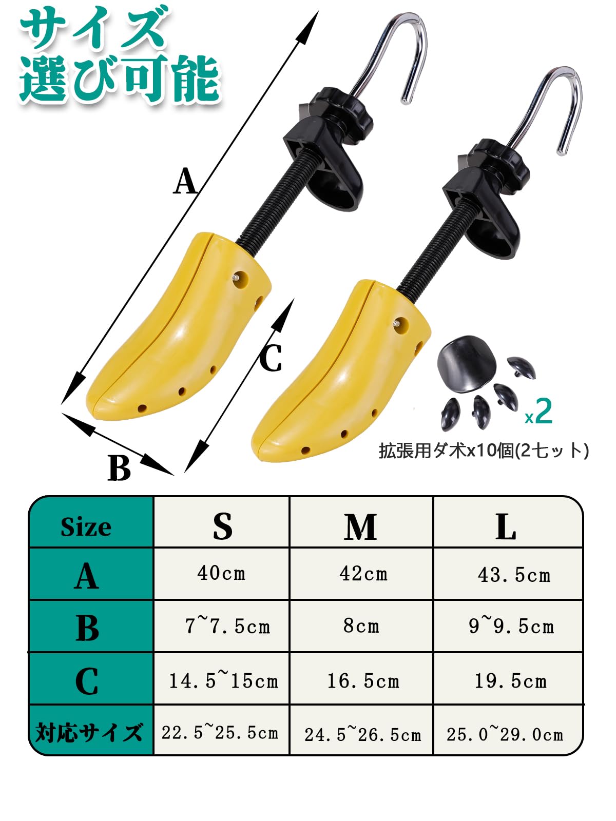ピンポイント伸ばし:拡張用のダボを差し込むと、特に伸ばしたい部分を伸ばすこともできます 。形とサイズの違うダボが10個(つま先ダボ8個+足の甲を伸ばしダボ2個)付属しており、ダボを使って、靴のピンポイントで広がります。