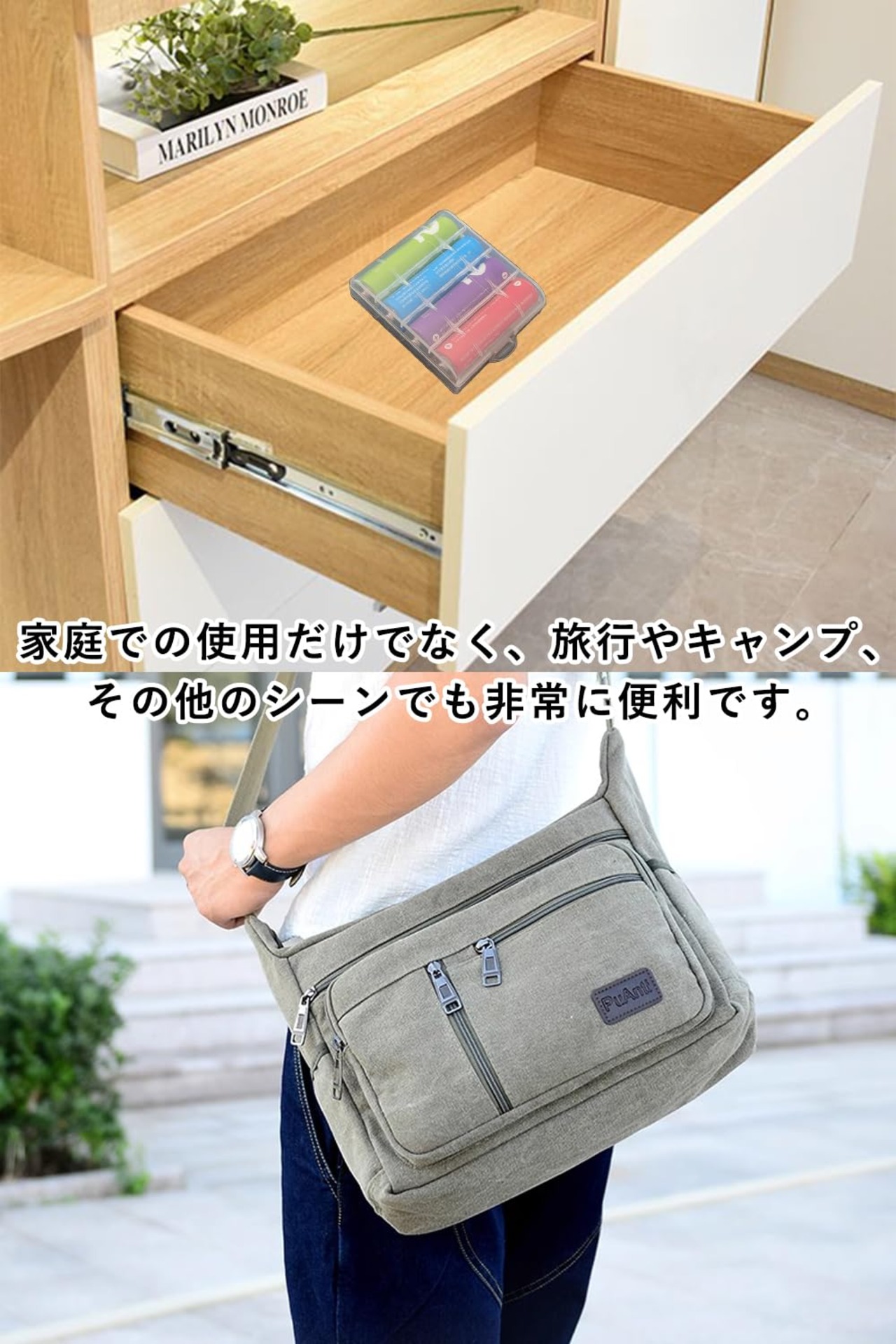 棚、引き出し、工具箱、ポケット、バックパックに入れることができ、持ち運びに便利な電池用ケースです。