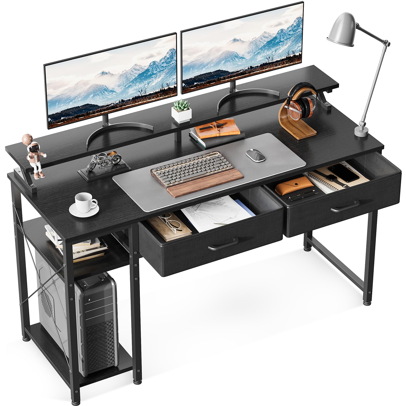 ODK ゲーミングデスク ラック&引き出し2杯付き 幅120cm パソコンデスク 机 pcデスク モニター台付き ワークデスク オフィスデスク おしゃれ 省スペース 一人暮らし 在宅勤務 左右入れ替え対応 ブラック