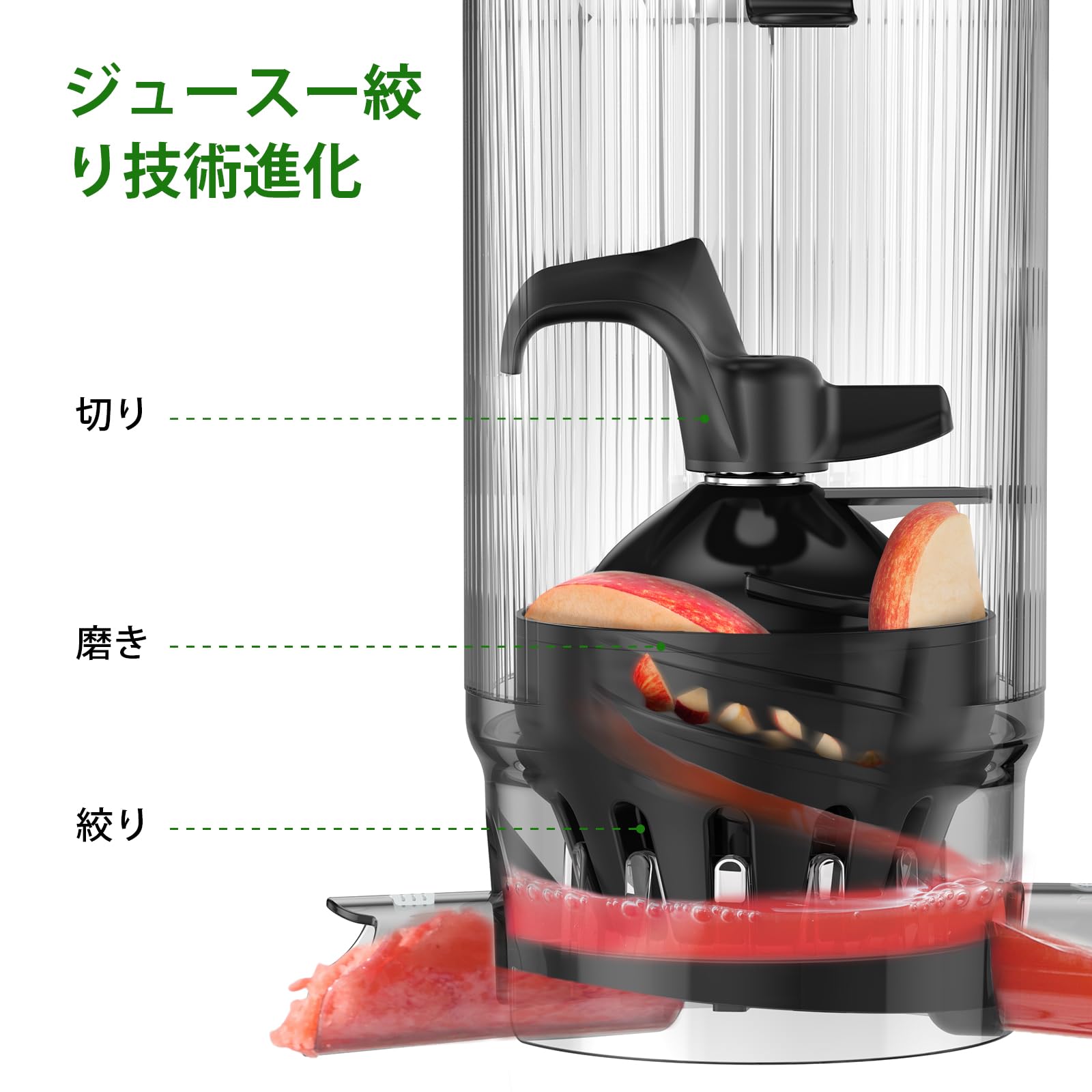 【13.46cm広い投入口で丸ごとの食材そのまま投入】最新進化した13.46cm広い投入口 スロージューサーは丸ごとのリンゴや野菜を細かくカット不要!従来品とは異なり、大きな果物や野菜をそのまま追加でき、準備時間を短縮できます。投入口から食材をポンと入れるだけで美味しいジュースが出来上がり!食材詰まりは逆回転ボタンを押して解消!食材によって、硬い皮や種等は取り除いて頂く必要があります