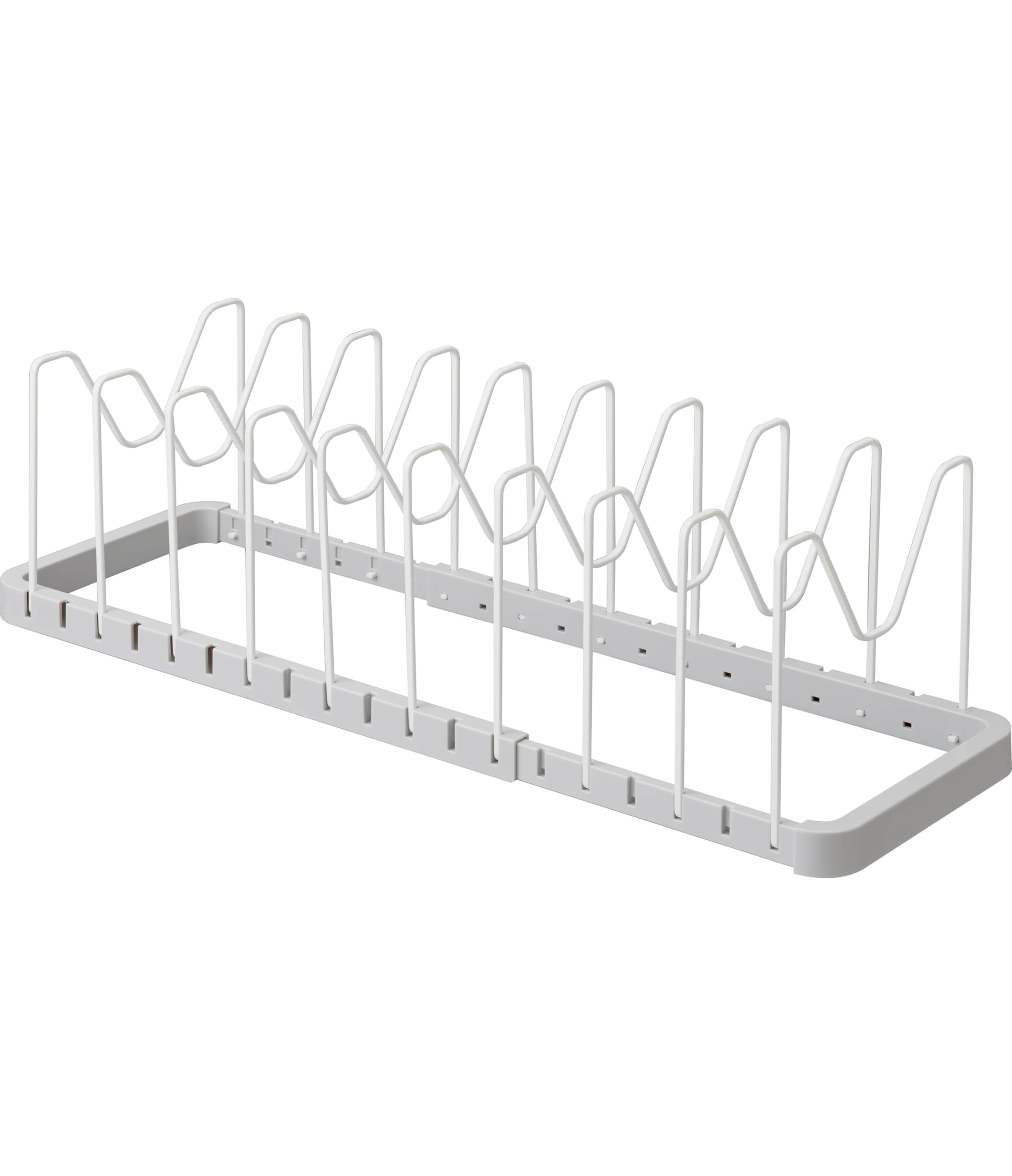 伸縮できるからシンク下のスペースに合わせてピッタリフィットするフライパン&鍋蓋スタンド。鍋やフライパンのサイズに合わせて仕切りパーツの位置は3cmごとに調整可能。持ち手が上になるから取り出しやすい持ち手置き付き。下に空いたスペースができるから収納力もアップします。