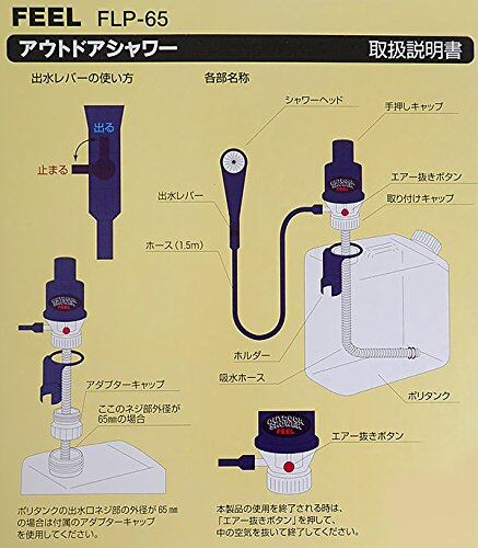 本格派シャワーヘッド採用! 市販のポリタンクに取り付けて使用します。 ペットボトルで作るロケットと同じ原理で、タンク内に圧力をかけて水を押し出す方式です。 乾電池などの電源不要なので、どんな場所使用できます。 ポリタンクの取水口のネジ部外径が50mmと65mmに対応。