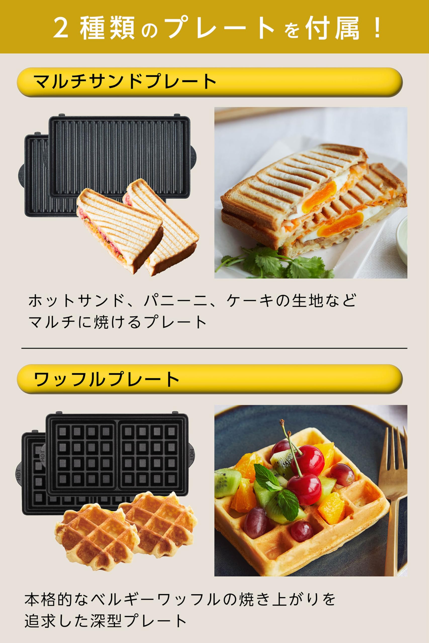 【サクッ、ふわっの焼き上がり】深型プレートと900Wのハイパワーで専門店のような焼き上がり。ワッフルプレート、マルチサンドプレートの2種類のプレートを付属なので、サンドイッチメーカーやワッフルメーカーとしてなどシーンに合わせてお使いいただけます。全10種類のスペシャルレシピ付きで、買ってすぐに使えます。